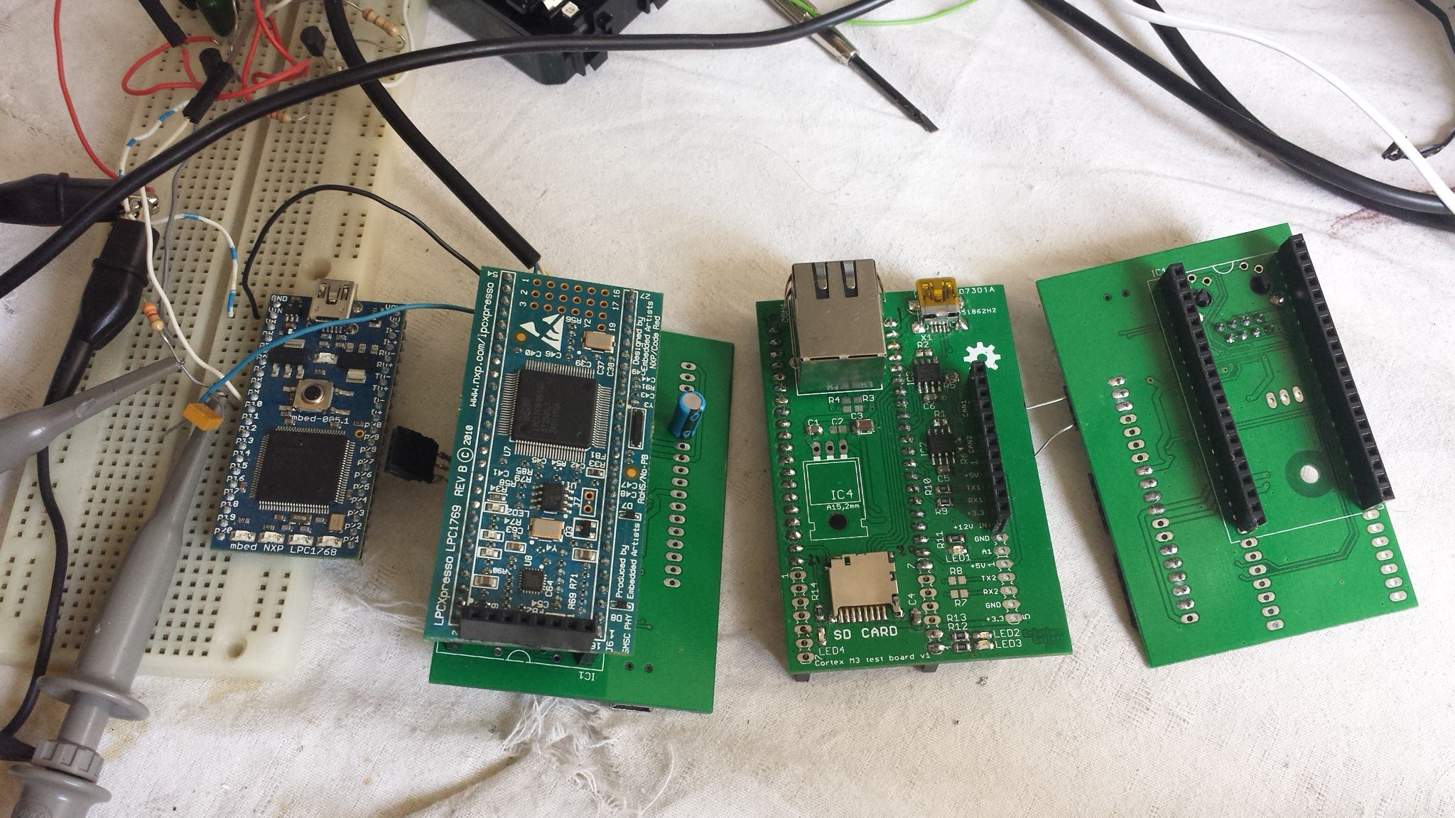 The board, as you can see in the picture, is just an expansion board for the awesome MBED project (www.mbed.org ) and features an sd card slot, 2 CAN transceivers, an ethernet port and an USB device port. The MBED is awesome because it offers a lot of cool libraries and even a ready to use and free RTOS; there is even a library to connect a 3G modem to the usb host port of the mcu. The compiler is online and allows an easy management of the project with an integrated cvs system, and if you don't like it, switching to the offline (proprietary :( but some open source alternatives based on gcc are already available) IDE is as easy as downloading the source file. A demo board that is fully compatible with the MBED is available from http://www.embeddedartists.com/products/ lpcxpresso/lpc1769_xpr.php , and that includes a programmer and debugger for less than the price of the PICKIT alone. I know that switching from a well known platform to ARM may seem like a very hard choice, I was a PIC lover too, but the MBED library greatly reduces the effort of porting the code to the new device. For example, adding an usb serial port is this easy: