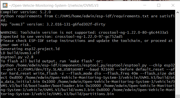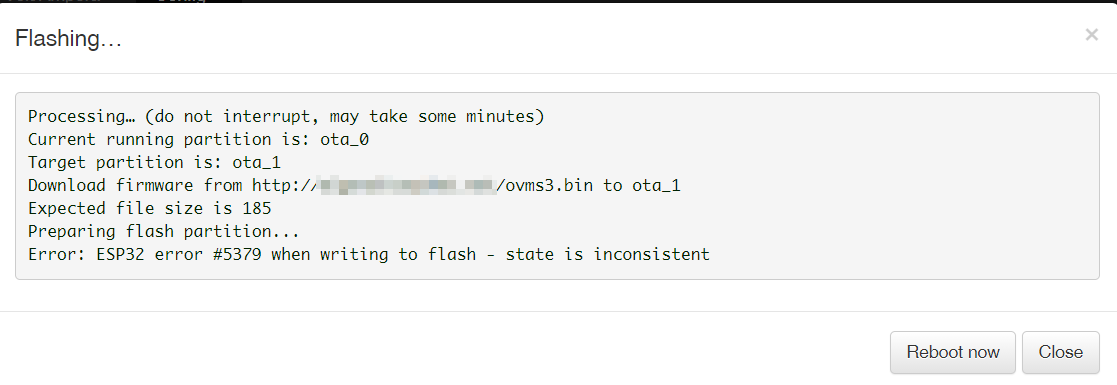A few issues: Your ‘expected file size is 185’ is wrong. Much too small. Should be >3MB for current firmware. Perhaps your URL path is incorrect, or some other issue with the download from the web server. You need to update your ESP IDF tools crosstool-ng to 1.22.0-97. That is in the xtensa-esp32-elf package. Run 'xtensa-esp32-elf-gcc -v’ to see your current version. Regards, Mark.