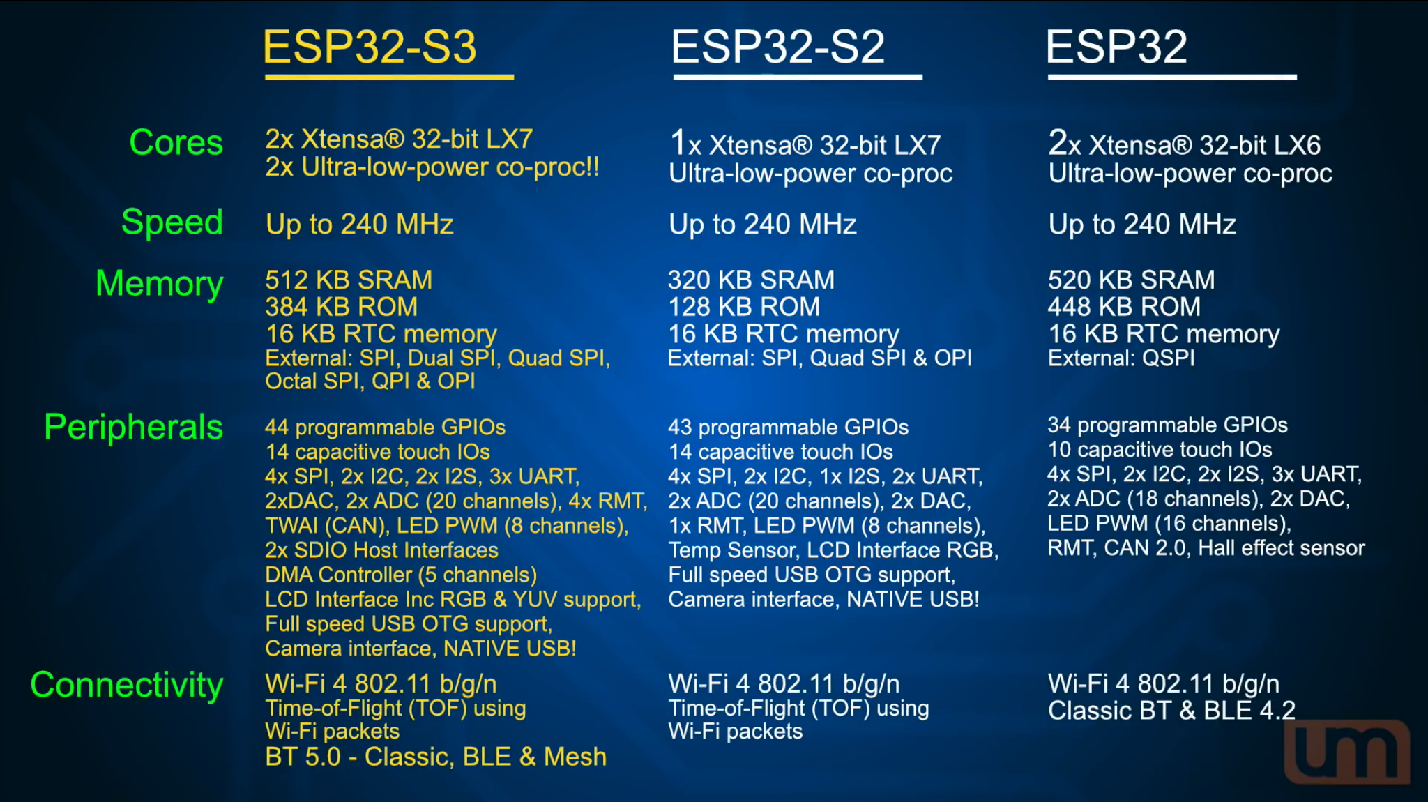 I don’t 100% understand it, but from what I’ve seen the SRAM in ESP32 is divided into 3 banks with fixed sizes and addresses (192KB, 128KB, and 200KB), with each bank having restrictions as to possible use. For us, available IRAM is a hard limit we are hitting. None of this is very configurable in the original ESP32, and revisions to silicon haven’t changed that. The S2 chips are a step down (seemingly trying to entice people away from the low end old ESP8266), and C3 further emphasises this with pin-to-pin ESP8266 compatibility. The S3 seems intended to be a step up, while still keeping the costs down. I’ve been told that S3 silicon changes this fixed arrangement of RAM. I was referred to the announcement statement “compared with ESP32, it supports larger, high-speed octal SPI flash, and PSRAM with configurable data and instruction cache". But still waiting to see the details. Apart from some early units in the hands of lucky testers, this is all we have: https://www.espressif.com/en/news/ESP32_S3 <https://www.espressif.com/en/news/ESP32_S3> Not even a data sheet. Definitely not a drop-in replacement module anyway, so even with hardware this will be a while away. I am just interested in it because it may give us a relatively smooth expansion path forwards for the three limits we are pushing up against (IRAM/RAM, GPIO, and flash size). There is also the rumour mill: https://www.esp32.com/viewtopic.php?t=18023 <https://www.esp32.com/viewtopic.php?t=18023> I guess we will have to wait and see… Regards, Mark P.S. Wikipedia further confuses the issue (https://en.wikipedia.org/wiki/ESP32 <https://en.wikipedia.org/wiki/ESP32>) by talking about the S3 having “a new microcontroller that features a dual-core Xtensa LX7 CPU core with a clock speed of up to 240MHz, 384 KB of RAM and an additional 384 KB of SRAM”. No idea where they are getting that from (maybe ROM not RAM)?).