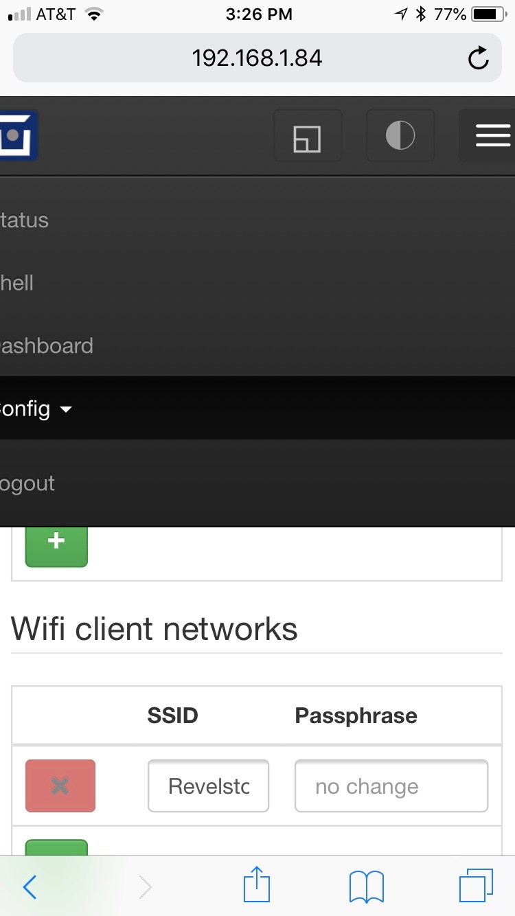 I'm running iOS 11.3 on an iPhone 7. When I connected to the OVMS webserver from the phone for the first time I clicked through a couple of pages to the Wifi config and then wanted to go to another page so I needed to drop down the menu. When I did so, it was clipped as you see in the attached screenshot. I could shrink it back to fit with a squeeze gesture. I'm sure I had not done an expand gesture beforehand, but when I tried deleting that page from the browser history and then going back again I did not see the problem. I'll try to be more observant watching for a repeat. -- Steve