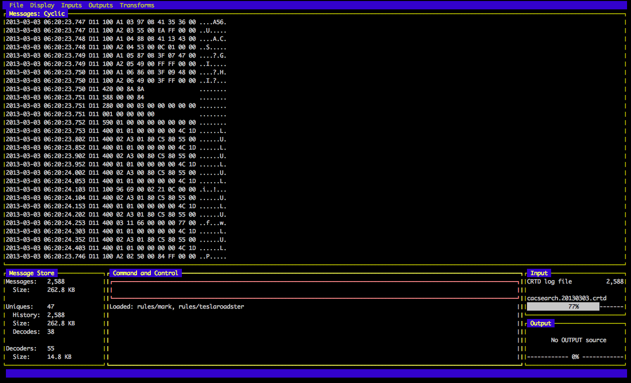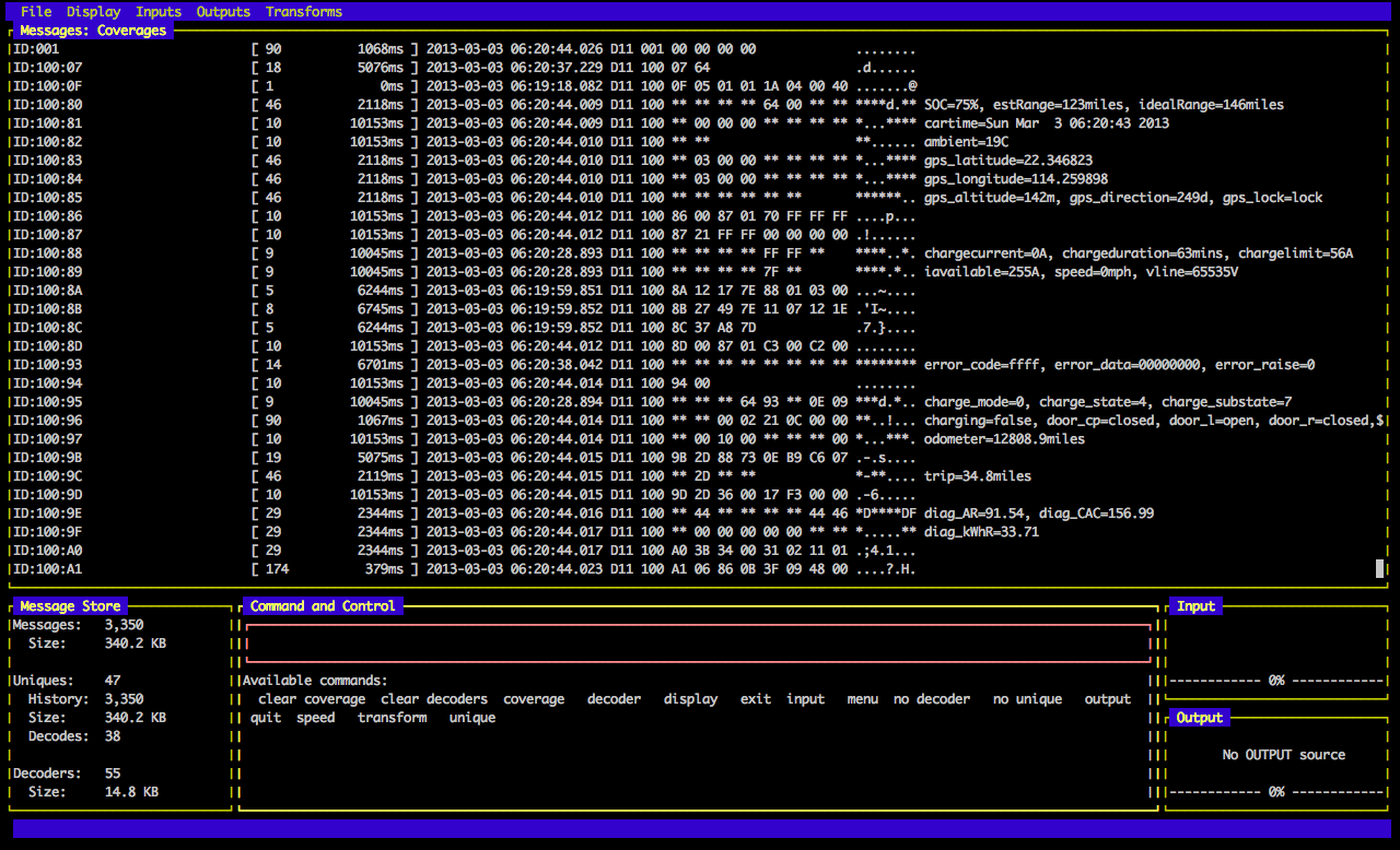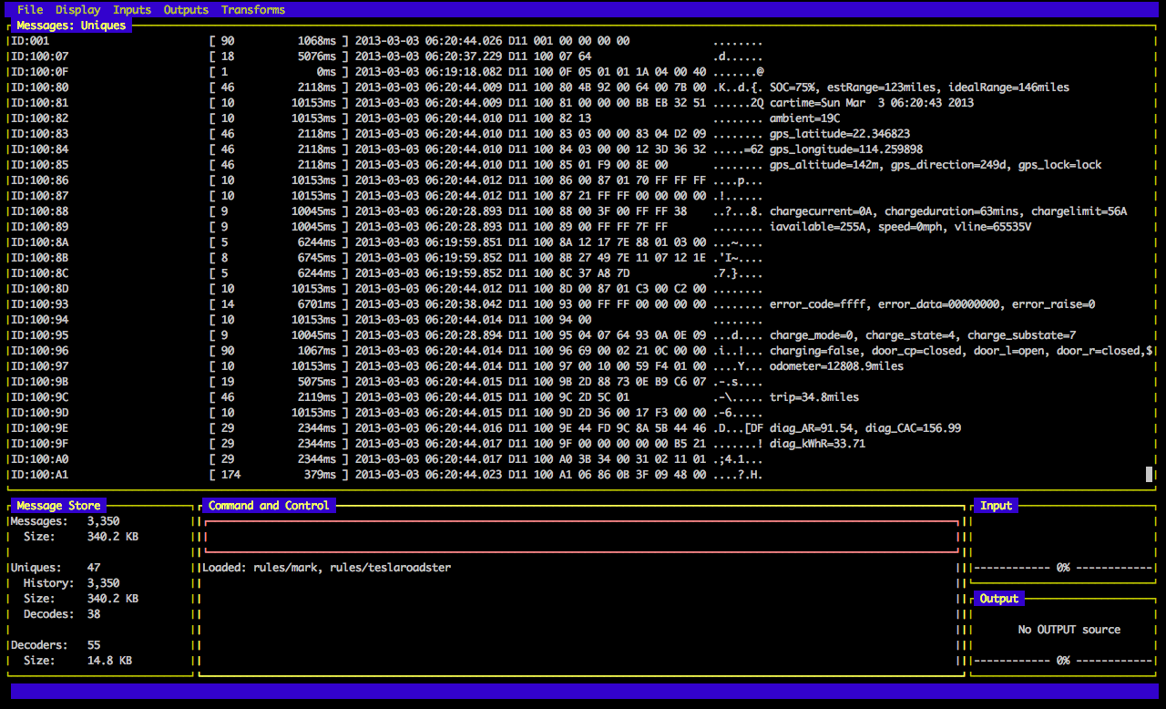 It works with an Input-Transfrom-Output model, with optional displays. You can define the input as either a disk-based log file (CRTD format) or a CAN-USB adaptor to input from. The output can be discard, disk-based log, or CAN-USB adaptor to output to. The transforms take the input and perform optional transformations. At the start, the main transform is 'Uniques' - which find unique messages and keeps a history of updates to them. The input can be real-time or sped-up/slowed-down.