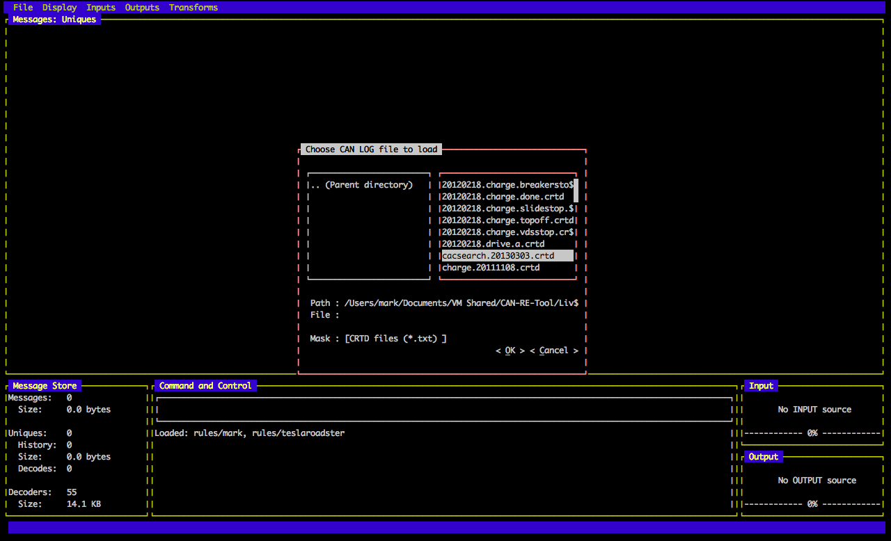 I've launched a new project on github: https://github.com/markwj/CAN-RE-Tool Background is that I'm pissed how costly CAN-USB adaptors are. For what they are, the cost is too high and the software is terrible. If you want the good software, the hardware cost is beyond ludicrous (thousand of dollars). Bill of materials for these things is around US$20-US$30. Street price is US$150 upwards (excluding shipping). I've got a hardware design (based on PIC32 and MCP2551 chips, plus a little power regulator), and I''m working with China factory to see if we can get these down to US$50-60 (including shipping). On the software side, I've released the CAN-RE-TOOL source code. This is perl code (but with a few libraries necessary), and pretty neat. Still very much a work-in-progress, but very usable. Some notes: It should be cross platform - just textual curses based. But, only tested on OSX so far. Linux should be easy, but not sure about Windows. It works with an Input-Transfrom-Output model, with optional displays. You can define the input as either a disk-based log file (CRTD format) or a CAN-USB adaptor to input from. The output can be discard, disk-based log, or CAN-USB adaptor to output to. The transforms take the input and perform optional transformations. At the start, the main transform is 'Uniques' - which find unique messages and keeps a history of updates to them. The input can be real-time or sped-up/slowed-down. Various real-time displays can be called up, including Cyclic and Scrolling real-time message lists, Unique message display, and coverage (which shows just the parts of the unique messages not currently understood). The uniques system identifies messages by a combination of CAN arbitration IDs plus optional data bytes within the message (an example being Tesla Roadster using byte #1 of ID 0x100 as a unique message). Decoders can be defined, to produce sensors from the messages. These decoders document the protocol and message coverage. Everything is implemented as plugins, so it is very very expandable. I've working on a bunch of experimental plugins to do statistical and heuristic style analysis looking for patterns in the messages captured. Control is via mouse, keyboard commands, or scripts on disk. Here are some screens, to give you an idea of what is possible: Selecting a CRTD log file as the input source: Scrolling CAN message display (input is a CRTD log file being played back in real time): Uniques message display (note the decodes on the right, and message count + interval towards the left): Coverage message display (everything not '*' is unknown): The whole point of this is to provide a system to capture messages from the can bus, work out which messages are unique for that particular car, provide a facility to decode the messages to user-readable sensors (speed, SOC, CAC, odometer, etc), and finally to allow the vehicle message documentation to be produced. It does all this today. Perl is used to make this all scriptable and extremely quick/simple to extend. In future, I'm also interested in providing a facility to simulate a vehicle (we can only do that now by replaying a log file back out). OBDII style support work also be useful (include a PID scanner). This is mostly for me, but I'm putting it out there and sharing it in case anyone else needs this. Regards, Mark.