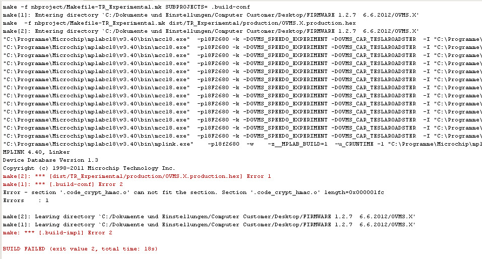Thanks for your advice, Tom . Problem solved. I used the1.2.7 hex file from your homepage. I built a new project and I was able to flash the OVMS. The Tesla homelink function from iOS App works very well . Better than the homelink in the car (sometimes I have to touch the screen 3 to 4 times). The other functions (especially speedo) are working good. Piotr Von: ovmsdev-bounces@lists.teslaclub.hk [mailto:ovmsdev-bounces@lists.teslaclub.hk] Im Auftrag von Mark Webb-Johnson Gesendet: Samstag, 9. Juni 2012 15:18 An: OVMS Developers Betreff: Re: [Ovmsdev] Car firmware v1.2.7 I'm using: Product Version: MPLAB X IDE Beta7.02 Java: 1.6.0_31; Java HotSpot(TM) 64-Bit Server VM 20.6-b01-415 System: Mac OS X version 10.7.4 running on x86_64; MacRoman; en_US (mplab) mcc18: v3.40 My mplink, on a clean-and-build gives: /Applications/microchip/mplabc18/v3.40/bin/mplink -p18f2680 -w -z__MPLAB_BUILD=1 -u_CRUNTIME -l /Applications/microchip/mplabc18/v3.40/bin/../lib -odist/TR_Experimental/production/OVMS.X.production.cof build/TR_Experimental/production/UARTIntC.o build/TR_Experimental/production/can_teslaroadster.o build/TR_Experimental/production/crypt_base64.o build/TR_Experimental/production/crypt_hmac.o build/TR_Experimental/production/crypt_md5.o build/TR_Experimental/production/crypt_rc4.o build/TR_Experimental/production/led.o build/TR_Experimental/production/net.o build/TR_Experimental/production/net_msg.o build/TR_Experimental/production/net_sms.o build/TR_Experimental/production/ovms.o build/TR_Experimental/production/params.o build/TR_Experimental/production/utils.o MPLINK 4.40, Linker Device Database Version 1.3 Copyright (c) 1998-2011 Microchip Technology Inc. Errors : 0 I'm on a mac, running the beta mplabx (if it ain't broke, don't ...) Are Tom and Piotr getting exactly the same error in the hmac module? Strange because that module hasn't changed since the beginning of OVMS. Mark On 9 Jun, 2012, at 1:49 AM, Tom Saxton wrote: I had the same problem trying to build last week. Mark gave me a list of things to check, then life happened and I just got back to it. I'm using MPLAB X v1.10 and mcc18 v3.40. I chose TR_Production for the build settings, confirmed that mcc18 optimizations are set to "Enable all" and did a "Clean and Build" (not "Clean and Build for Debugging"). I still get the linker error, same as before. I get the same result for the TR_Experimental build. Wondering if I had done something to mess up my sources, I deleted the entire OVMS project directory, did a fresh git clone, and repeated the steps. Same result. Tom PS: You can copy from the build output window and paste into a text file. This yields a much smaller email attachment and it doesn't crop off the end of the build commands. on 6/8/12 10:07 AM, 911carrera4 wrote: Hi guys Unfortunately I have a problem with the compilation of the firmaware files 1.2.7. I'm using MPLAB X DIE 1.00 Please see enclosed picture. I can't compile the project and also the use of the hex-file for flashing is impossible. Does this sound familiar to anyone? The previously released firmware versions worked out fine. Greetings, Piotr
