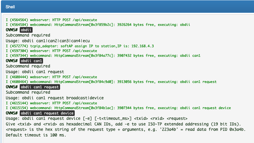 Here is a screenshot of my session with "obdii" command. Don't hesitate to post here :ovmsdev@lists.openvehicles.com You will get a quick answer from the core developement team of OVMS. Didier Le vendredi 26 février 2021 13 h 01 min 39 s UTC−5, Angelo Russo <ing.angelorusso@icloud.com> a écrit : No way !!! Maybe I will start over all OVMS initialing procedure. It’s a very strange issue. Can you please confirm you can use odbii command without typing ECU? ————————— This e-mail is strictly confidential. It is intended for the sole use of the individual or entity to which it is addressed and may contain information that is privileged, confidential and exempt from disclosure under applicable law. You are hereby notified that any dissemination, distribution or duplication of this message by someone else than the intended addressee or its designed agent is strictly prohibited and may breach art. 616 and ff. of the criminal code. Should you receive this e-mail by mistake please notify this firm immediately and delete the message from all locations in your computer.