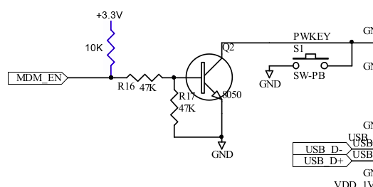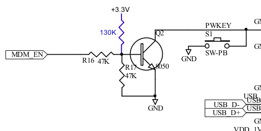 Craig, Mark, I just stumbled upon a misreading from my side: I had accidentally taken the v3.0 schematics of the main board for reference, that only had pull-ups on ports 1 & 2. There was a change in v3.1 adding pull-up resistors on ports 0 & 3 as well. So with a 3.1/3.2 module, there actually is a 10K pullup on both MDM_EN and MDM_DTR, before the transistor. With that 10K, we have this transistor control: That should result in ~1.5V at the base on MDM_EN high, enough for the transistor to switch, so I don't know what's going wrong here. You can access both pullups from the side, they are located left of the S2 switch on the main board. R8 is on MDM_EN, R9 on MDM_DTR. R8 shows that very short rise in voltage on transition to high, while R9 shows the expected behaviour of a constant +3.3 when the port is high. Regards, Michael Am 18.11.19 um 02:47 schrieb Mark Webb-Johnson: