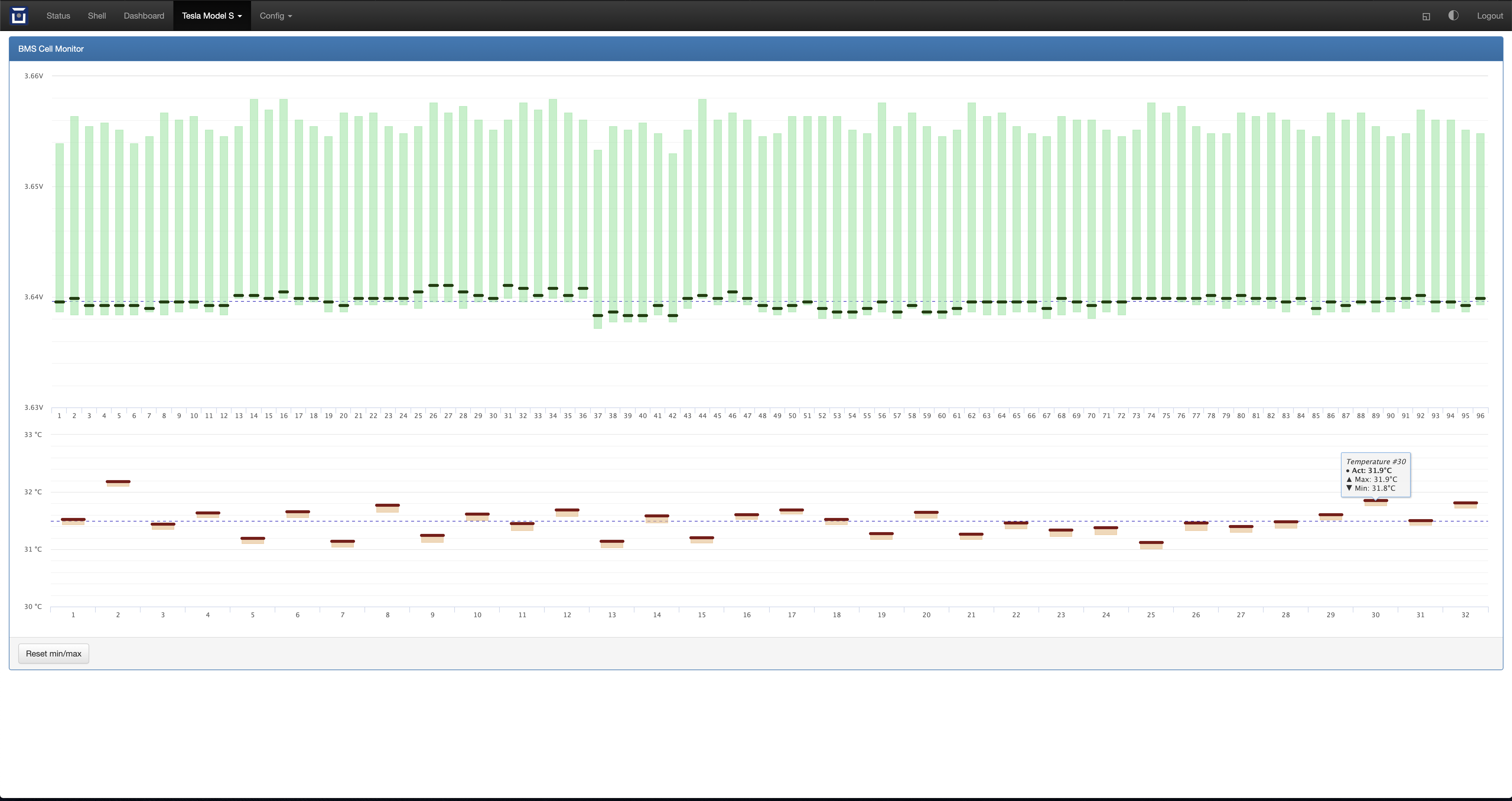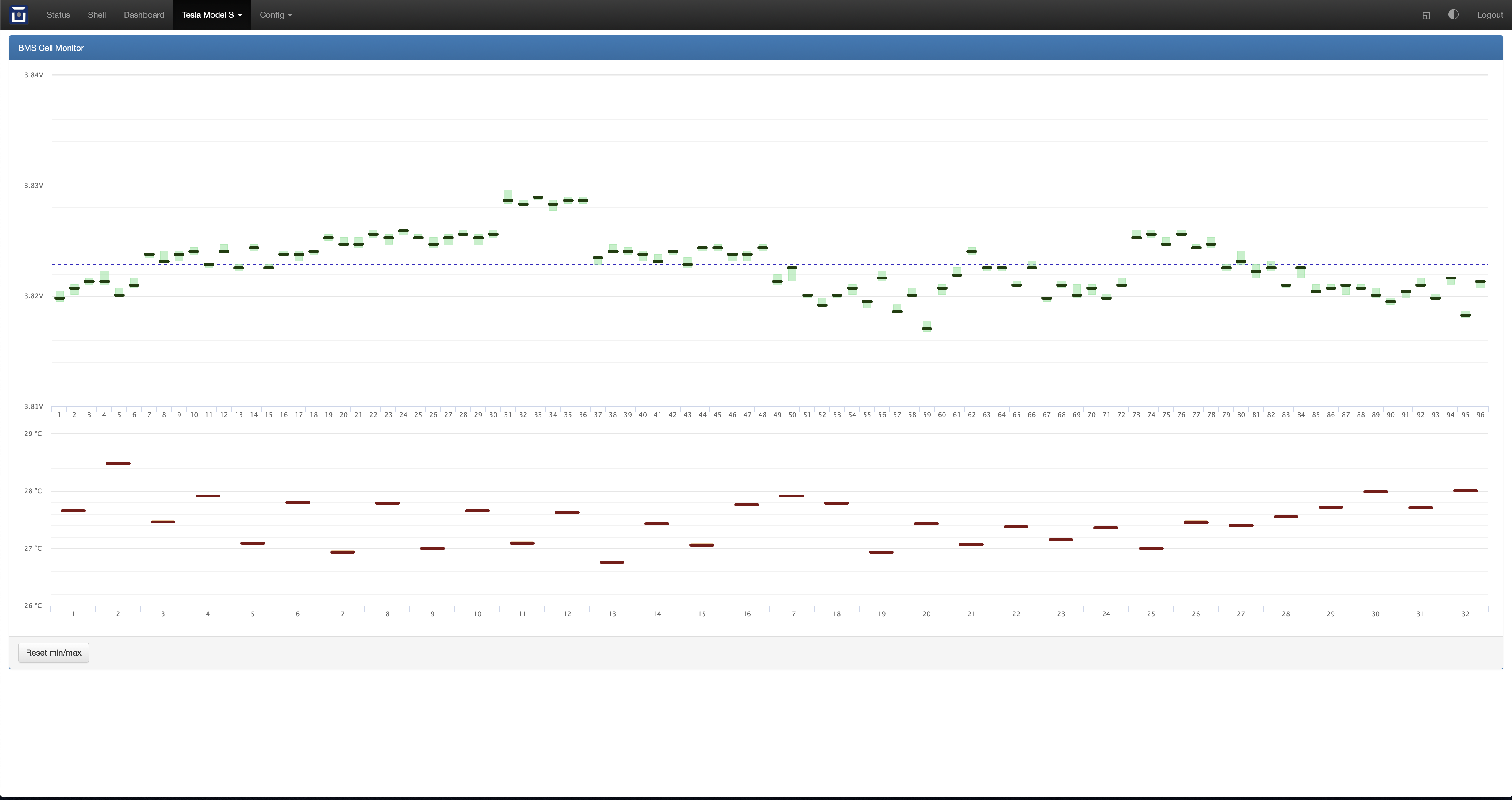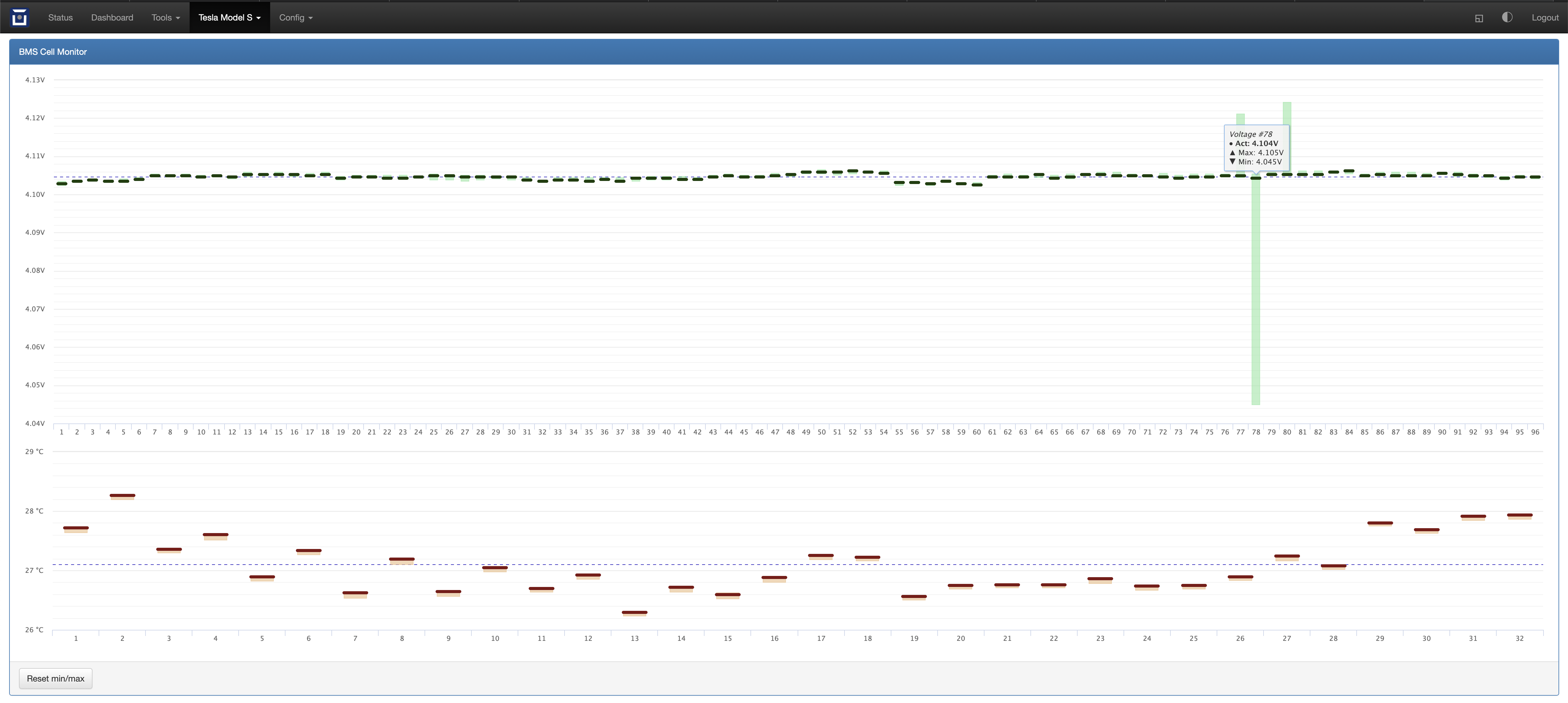There are some strange high and low values (-100C for temperatures, and +5V for voltages) - seemingly when the car wakes up or goes to sleep. I have added some functions in vehicle.{h, cpp} to provide automatic sanity checking (based on limits provided by the vehicle). On the Model S, that is now better, but still giving issues: OVMS# bms alerts Voltage: SD=5mV !77:+16mV !78:-59mV !80:+19mV Temperature: SD=0.7C ?1:+0.6C ?2:+1.2C ?3:+0.3C !4:+0.5C ?6:+0.2C !7:-0.5C ?9:-0.5C ?11:-0.4C ?13:-0.8C ?14:-0.4C !15:-0.5C !19:-0.5C ?20:-0.3C ?21:-0.3C ?22:-0.3C ?23:-0.2C ?24:-0.4C ?25:-0.3C ?29:+0.7C ?30:+0.6C ?31:+0.8C ?32:+0.9C I think the temperature variances are correct and normal. I see some big differences in voltage min/max on some cells that look like spurious readings. Not sure how to address that - it is going to be hard to discard these readings. For example, see attached. Regards, Mark