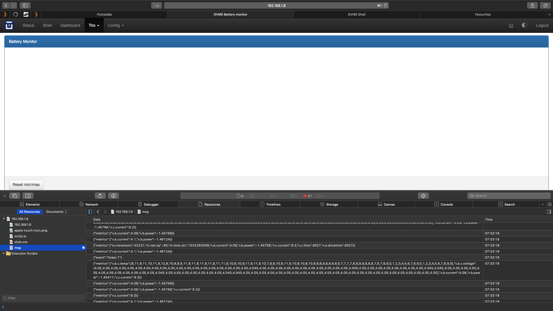 Not really sure how to interpret this. I get: OVMS# bms alerts Voltage: SD=7mV !1:-7mV !2:-4mV !3:-4mV !4:-5mV !5:-5mV !6:-6mV !7:-1mV !8:+2mV !9:+0mV !10:+0mV !11:+0mV !12:-2mV ?13:+0mV !14:+4mV !15:+2mV !16:+2mV !17:+0mV !18:+0mV !19:-3mV !20:+0mV !21:-1mV ?22:+0mV !23:-2mV !24:-2mV !26:+2mV !27:+1mV !28:+2mV ?29:+0mV !30:+0mV !31:-2mV ?33:+0mV !35:-1mV !36:-2mV ?37:-5mV !38:-3mV !39:-2mV !40:-2mV !41:-4mV !42:-6mV !43:-3mV !44:+0mV !45:-1mV !46:-1mV !47:-1mV !48:-1mV !49:+6mV !50:+7mV !51:+6mV !52:+8mV !53:+7mV !54:+6mV !55:+1mV !56:+4mV !57:+1mV !58:+4mV !59:+0mV !60:+0mV !61:+3mV !62:+5mV !63:+4mV !64:+4mV !65:+2mV !66:+3mV !67:-1mV !68:+2mV !69:+1mV !70:+1mV !71:-1mV !72:-1mV !74:+2mV !76:+1mV ?77:+0mV !78:-1mV !79:+1mV !80:+3mV !81:+1mV !82:+2mV !83:+2mV !84:+1mV !85:-3mV !86:+2mV !87:-1mV !88:-1mV !89:-3mV !90:-2mV !91:-2mV !92:-1mV !93:-2mV !94:-2mV !95:-3mV !96:-4mV Temperature: SD=0.6C ?1:+0.5C ?2:+1.0C ?3:+0.3C ?4:+0.3C ?5:-0.2C ?7:-0.3C ?9:-0.2C !10:-0.2C ?12:-0.4C ?13:-0.3C ?14:-0.4C ?15:-0.5C ?16:-0.3C ?17:+0.8C !18:-0.3C ?19:-0.1C ?20:-0.3C ?21:-0.1C !22:-0.4C !24:-0.5C ?25:-0.3C ?26:-0.4C ?28:-0.3C ?29:+0.7C ?30:+0.3C ?31:+0.9C ?32:+0.5C OVMS# metrics list v.b.c v.b.c.temp 28.8652,29.4386,28.6334,28.6822,28.1942,28.5114,28.1454,28.4626,28.182,28.3406,28.3894,28.121,28.1088,28.1454,28.0112,28.182,28.9262,28.243,28.2674,28.2186,28.2918,28.0844,28.3528,28.0356,28.1454,28.1088,28.4626,28.2186,28.975,28.7554,29.0604,28.9384°C v.b.c.temp.alert 1,2,1,1,1,1,1,0,1,2,0,1,1,1,1,1,2,2,1,1,1,1,1,1,1,1,0,1,2,1,1,2 v.b.c.temp.dev.max 0.52,1.03,0.31,0.26,-0.23,0.1,-0.29,-0.07,-0.25,-0.18,0.04,-0.44,-0.31,-0.39,-0.46,-0.34,0.76,-0.27,-0.15,-0.3,-0.13,-0.45,-0.08,-0.49,-0.28,-0.41,0.09,-0.28,0.73,0.34,0.92,0.52°C v.b.c.temp.max 28.8774,29.4386,28.6578,28.6822,28.1942,28.5236,28.1454,28.4626,28.182,28.3406,28.3894,28.121,28.1088,28.1454,28.0112,28.182,29.1092,28.243,28.2674,28.2186,28.2918,28.0844,28.3528,28.0356,28.1576,28.1088,28.4626,28.2186,29.0848,28.7554,29.2678,28.9384°C v.b.c.temp.min 28.853,29.3654,28.6212,28.5724,28.1332,28.3894,28.1088,28.2796,28.1332,28.1698,28.3894,27.9136,28.0966,27.9624,27.9014,28.0112,28.9262,28.0844,28.2674,28.0478,28.2796,27.9014,28.3406,27.8648,28.121,27.938,28.426,28.0722,28.975,28.609,29.0604,28.8042°C v.b.c.voltage 4.13794,4.14099,4.14099,4.14099,4.14007,4.13915,4.14465,4.1477,4.14586,4.14556,4.14465,4.14373,4.14556,4.14922,4.14739,4.14709,4.14586,4.14586,4.14251,4.14556,4.14434,4.14495,4.14373,4.14342,4.14586,4.148,4.14586,4.14709,4.14526,4.14526,4.14342,4.14556,4.14526,4.14556,4.14434,4.14342,4.14038,4.14251,4.14282,4.14312,4.14099,4.13946,4.14251,4.14586,4.14434,4.14465,4.14465,4.14434,4.15197,4.15318,4.15166,4.1541,4.15318,4.15166,4.14709,4.14922,4.14709,4.14861,4.14617,4.14586,4.148,4.15074,4.14983,4.15044,4.1477,4.148,4.14465,4.148,4.14678,4.14647,4.14403,4.14403,4.14556,4.148,4.14586,4.14647,4.14465,4.14526,4.14617,4.148,4.14617,4.14647,4.14739,4.14678,4.14251,4.14709,4.14373,4.14434,4.14282,4.14373,4.14312,4.14465,4.14282,4.14312,4.14282,4.1419V v.b.c.voltage.alert 2,1,1,1,1,1,2,1,2,2,2,2,1,1,1,2,2,2,1,2,2,1,1,1,0,1,2,2,1,2,1,0,1,0,2,2,1,1,1,1,1,1,1,2,2,2,2,2,1,2,1,2,2,1,2,1,2,1,2,2,1,1,1,1,1,1,2,1,2,2,2,2,0,1,0,2,1,2,2,1,2,2,2,2,1,2,2,2,1,1,1,2,1,1,1,1 v.b.c.voltage.dev.max -0.0082,-0.00487,-0.00498,-0.00508,-0.00583,-0.00674,-0.00139,0.00257,0.00096,0.00086,-0.00096,-0.00221,-0.00061,0.004,0.00275,0.00217,0.00096,0.00077,-0.0034,0.00081,-0.0017,-0.00091,-0.00234,-0.00304,0.00068,0.00288,0.00124,0.0022,-0.00052,-0.00078,-0.0024,0.00095,-0.00103,-0.00061,-0.00179,-0.00224,-0.00546,-0.00335,-0.0032,-0.00271,-0.00506,-0.00644,-0.0036,0.00087,-0.00129,-0.00168,-0.00139,-0.00132,0.00648,0.00824,0.00648,0.00883,0.0081,0.00641,0.00161,0.00443,0.00222,0.00401,0.00096,0.00095,0.00342,0.00597,0.00469,0.00505,0.00318,0.00315,-0.00127,0.00291,0.00132,0.00197,-0.0024,-0.00168,-0.00072,0.00275,0.00069,0.00184,-0.00096,-0.0012,0.00125,0.0032,0.00166,0.00203,0.00291,0.00153,-0.00355,0.00214,-0.00225,-0.00171,-0.003,-0.00249,-0.00292,-0.00152,-0.00295,-0.00296,-0.00311,-0.00432V v.b.c.voltage.max 4.13794,4.14129,4.14099,4.14099,4.14007,4.13915,4.14465,4.1477,4.14586,4.14586,4.14556,4.14403,4.14556,4.14922,4.1477,4.14709,4.14586,4.14586,4.14251,4.14586,4.14434,4.14495,4.14373,4.14342,4.14586,4.148,4.14617,4.14709,4.14556,4.14526,4.14342,4.14586,4.14526,4.14556,4.14434,4.14373,4.14099,4.14282,4.14282,4.14312,4.14099,4.13946,4.14282,4.14617,4.14465,4.14465,4.14465,4.14434,4.15197,4.15349,4.15197,4.1541,4.15318,4.15166,4.14709,4.14922,4.14709,4.14861,4.14617,4.14647,4.14861,4.15105,4.15014,4.15044,4.1483,4.1483,4.14465,4.148,4.14678,4.14709,4.14403,4.14403,4.14556,4.148,4.14586,4.14709,4.14526,4.14526,4.14647,4.148,4.14709,4.14739,4.1483,4.14678,4.14282,4.14709,4.14403,4.14434,4.14312,4.14373,4.14312,4.14465,4.14312,4.14312,4.14312,4.1419V v.b.c.voltage.min 4.13123,4.13427,4.13397,4.13397,4.13336,4.13214,4.13732,4.14038,4.13915,4.13885,4.13794,4.13641,4.13824,4.14159,4.14068,4.14007,4.13855,4.13824,4.1355,4.13885,4.13702,4.13794,4.13611,4.1358,4.13855,4.14099,4.13915,4.14007,4.13794,4.13794,4.13641,4.13855,4.13794,4.13824,4.13702,4.13641,4.13367,4.1358,4.1355,4.1358,4.13397,4.13275,4.13488,4.13855,4.13702,4.13702,4.13702,4.13732,4.14342,4.14586,4.14403,4.14617,4.14526,4.14403,4.13824,4.14159,4.13946,4.14038,4.13824,4.13824,4.14099,4.14342,4.14251,4.14251,4.14068,4.14038,4.13732,4.14099,4.13946,4.13976,4.13671,4.13671,4.13794,4.14038,4.13824,4.13946,4.13763,4.13763,4.13885,4.14038,4.13915,4.13946,4.14068,4.13885,4.1355,4.14007,4.13671,4.13732,4.13611,4.13641,4.13641,4.13732,4.13611,4.13641,4.13611,4.13458V v.b.cac v.b.consumption 0Wh/km v.b.coulomb.recd v.b.coulomb.used v.b.current OVMS# metrics list v.b.p v.b.p.level.avg v.b.p.level.max v.b.p.level.min v.b.p.level.stddev v.b.p.temp.avg 28.43°C v.b.p.temp.max 29.4508°C v.b.p.temp.min 28.0234°C v.b.p.temp.stddev 0.36°C v.b.p.temp.stddev.max 0.65°C v.b.p.voltage.avg 4.14669V v.b.p.voltage.max 4.15532V v.b.p