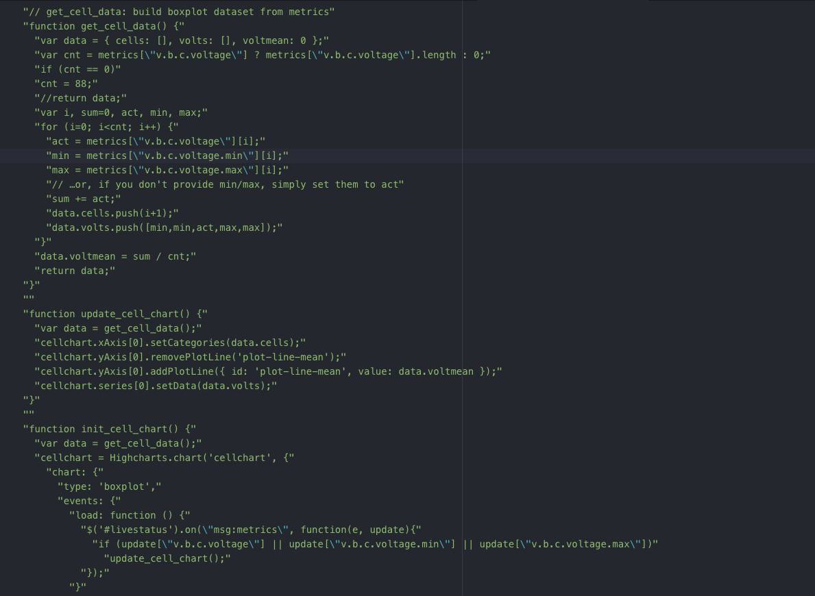 To generate C/C++ syntax from the file, use the script bin/mksrc: "bin/mksrc cellchart.htm >cellchart.cpp". The chart init URL needs to be changed for the production environment (see comment), and the test data generator can be removed. See OvmsVehicleRenaultTwizy::WebBattMon for reference.