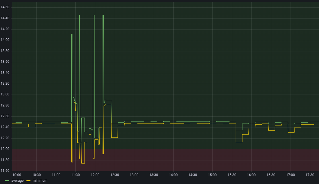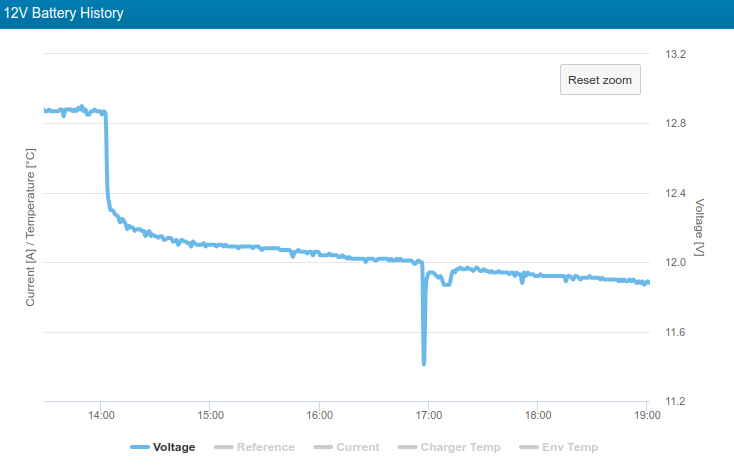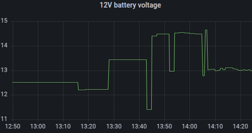 I recorded the attached 12v profile on the 7th via MQTT. It was 12.2 at 13:17, and briefly 11.4 at 13:43. The 14:02 dip is not visible. My battery was new in November 2023.