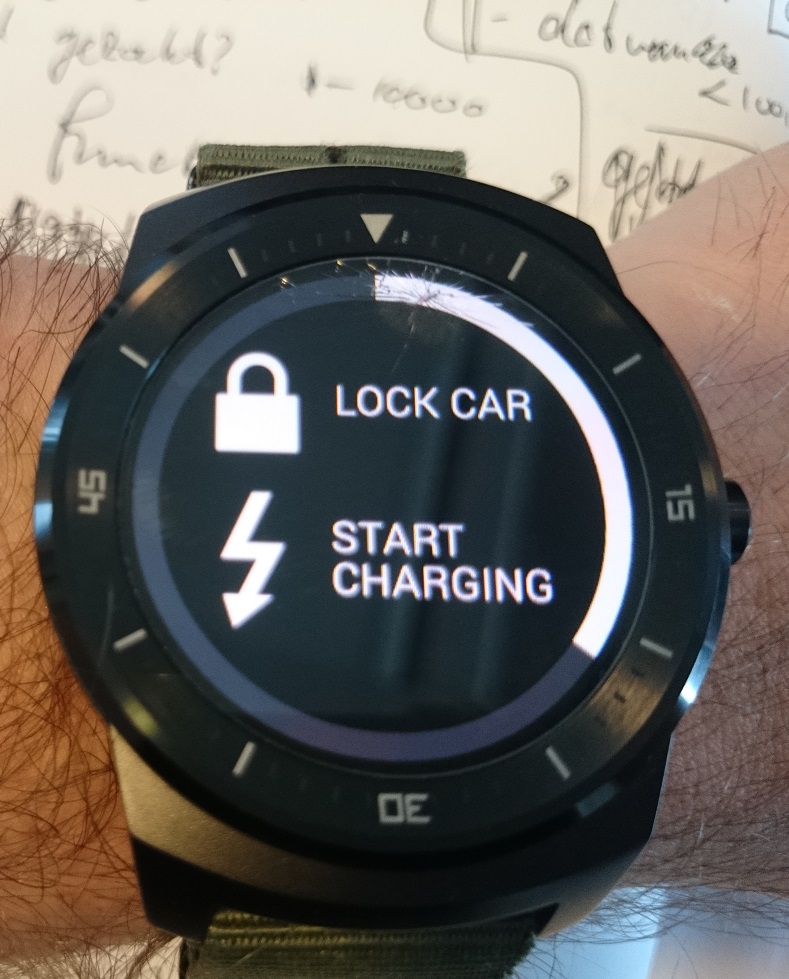 Here's a quick preview of my Android Wear tryout. So far it only shows the current SOC %, and can start a charge. Unlocking is not possible yet, because I didn't find out yet how to handle the PIN on the watch, and I'm not even sure if I would want to enter the PIN as a user... But first I'll migrate to Android Studio, since I've read that it will make life with Android Wear development a lot less complicated. As always, feel free to shoot or share ideas.