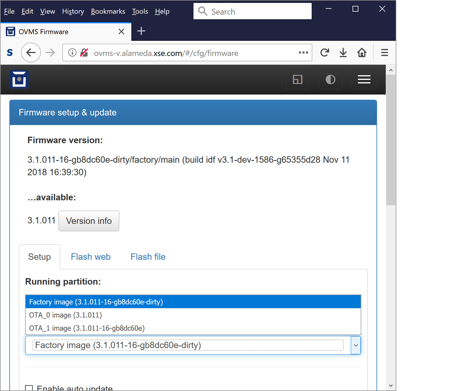 OVMS# ota status Firmware: 3.1.011-16-gb8dc60e-dirty/factory/main (build idf v3.1-dev-1586-g65355d28 Nov 11 2018 16:39:30)