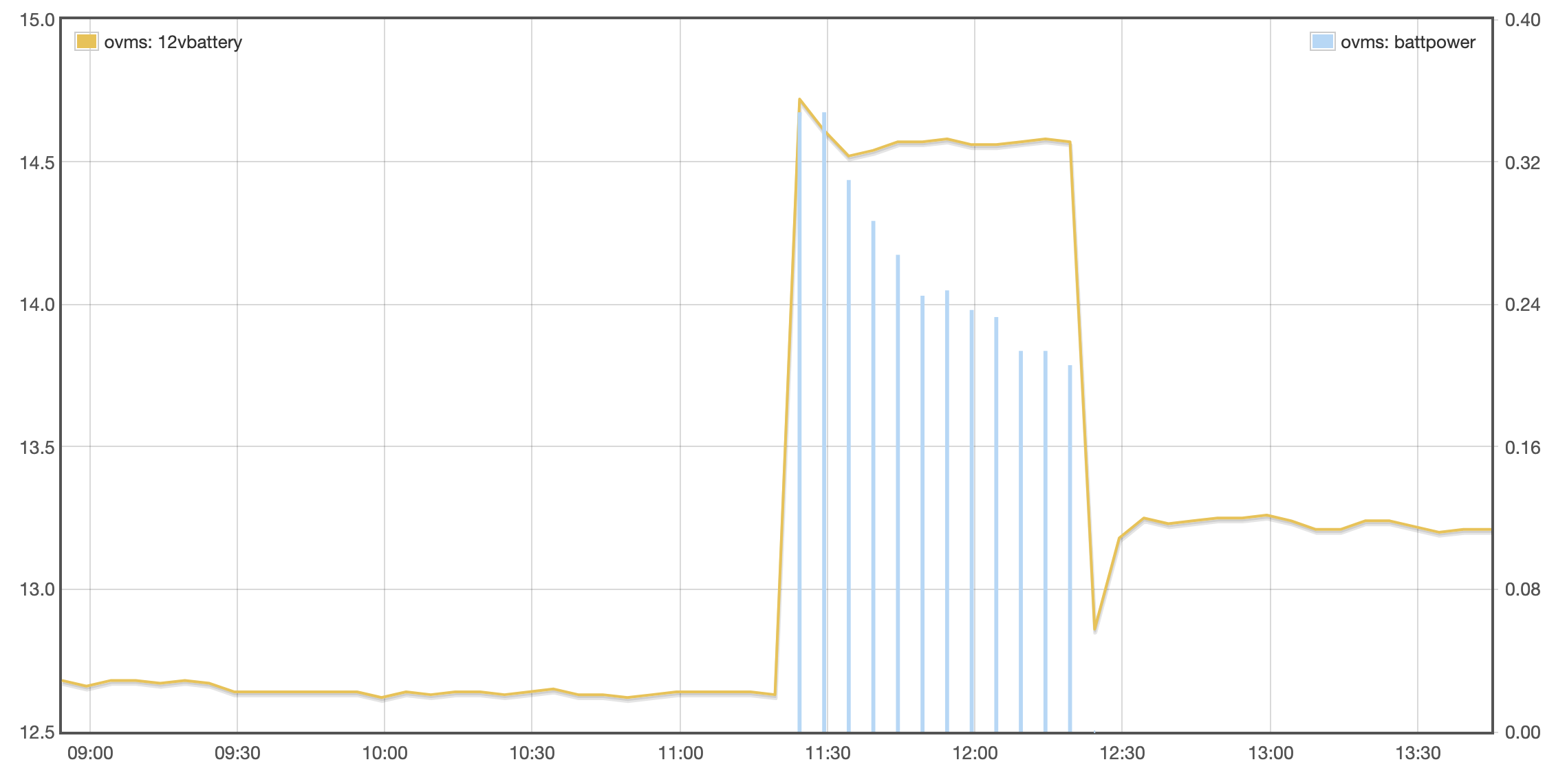 Hi, Do other vehicle types also do this? My car was locked and parked since yesterday about 10:30 UTC. Not connected to the EVSE/charger. I was monitoring and I noticed that by itself it turned on the dc/dc and started a 12v battery charge The battery was 12.6V at the time and it charged it for an hour and then went back to sleep. Battery was bumped up to 13.2V. 2021-01-16T09:25:21+0000 ovms/CAA5060/event vehicle.awake 2021-01-16T09:25:24+0000 ovms/CAA5060/event vehicle.locked 2021-01-16T09:25:24+0000 ovms/CAA5060/event vehicle.charge.state 2021-01-16T09:25:24+0000 ovms/CAA5060/event vehicle.charge.12v.start ... 2021-01-16T09:26:42+0000 ovms/CAA5060/metric/v/b/12v/current -9.52 2021-01-16T09:26:42+0000 ovms/CAA5060/metric/v/b/12v/voltage 14.72 2021-01-16T09:26:42+0000 ovms/CAA5060/metric/v/e/charging12v yes ... 2021-01-16T09:40:20+0000 ovms/CAA5060/notify/alert/vehicle.idle Vehicle is idling / stopped turned on 2021-01-16T09:40:20+0000 ovms/CAA5060/event notify.alert.vehicle.idle ... 2021-01-16T10:25:33+0000 ovms/CAA5060/event vehicle.charge.12v.stop ... Chart in localtime (+0200): [image: image.png] I did wonder if this would trigger the car warning "Battery discharging while stopped" but it did not. So if the car manages the 12v battery I will adjust the warning in my docs about discharging the 12v battery by leaving the OVMS connected. Steve