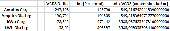 So I activate AmpHrs charged and discharged, and KwH charged and discharged from the list (4 values in total). VCDS shows me the final converted values on the screen: