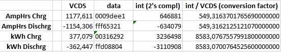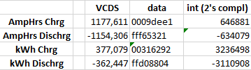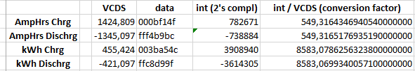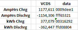 I've also confirmed this by waiting (with ignition on) until the last fraction of AmpHrs/kWh discharged values where changing in VCDS to -1154,307 and -362,448 and comparing it with the changed hex values. These hex numbers changed: 00 09 de e1 ff f6 53 20 00 31 62 92 ff d0 88 03