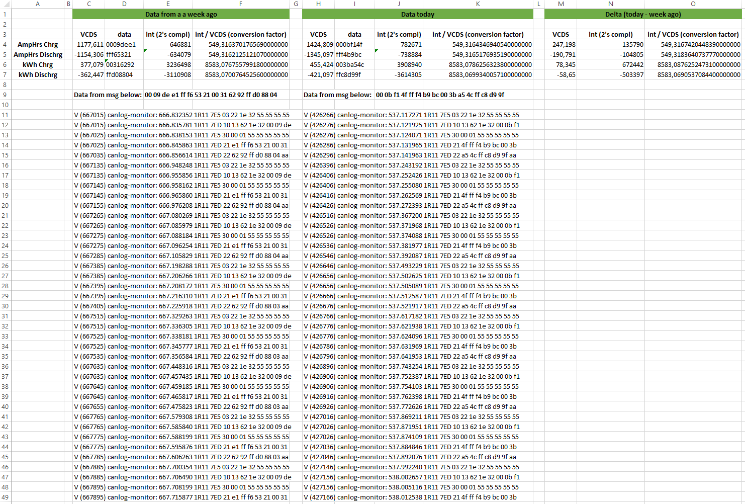 Hi, I'm trying to find the correct value conversions from the CAN-Hex values to the display values in VCDS. I cannot believe the values I'm getting though so I'd like to ask you for help guys as I ran out of ideas... Its about the Ah and kWh charged and discharged. All 4 values are at the same PID and I get 16 bytes as reply which suggests 4 bytes per value. (I've already checked if there are other values in this PID but there are not). Here is what I've done checked so far: 1. Swapping Ah data with kWh data. No luck as the conversion factors are just other weird values 2. Looking for an offset from 0. No luck as the delta-section below proves 3. As they are 4 bytes they may be no integer but float. Some of you might already see by the hex values that it can't be float I'm very grateful for any thoughts as this just can't be right as the conversion factor differs slightly with every day I'm taking new data... It might just be me interpreting the CAN-Hex data in a wrong way, but I can't find the error.