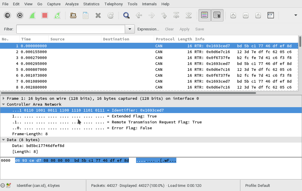 Maybe I misdiagnosed the problem. The problem is that Wireshark decodes the CAN bus header using one endianness and tcpdump records it using the other. I'm not sure which is more correct. The Linux SocketCAN system exposes the CAN bus to user space as a datagram socket. This way you can use tcpdump and Wireshark. The CAN bus frames are not passed over TCP. Here is a frame with identifier 0x1d4 captured from my leaf with tcpdump and displayed in wireshark. The first line is as captured, the second is after byte swapping the header. 0000 d4 01 00 00 08 ff ff ff a0 6d 00 00 42 06 40 60 .........m..B.@` 0000 00 00 01 d4 08 ff ff ff a0 6d 00 00 42 06 40 60 .........m..B.@` Wireshark thinks the un-swapped frame has the extended and remote transmission flags set because the first two bits are set. It thinks the id is 0x14010000 because it interprets the first 3 bits as flags, and the the rest as the identifier. The 0x08 is the length, followed by three padding bytes and then the actual payload data. I use https://carrott.org/git/leaf-can-dissector.git/blob/HEAD:/pcap-canid-endian-... to fix these. I haven't tried to work out why I have this problem or how to fix it properly. The SocketCAN candump utility has always given me correct results. Greg, does candump agree with wireshark on your system?