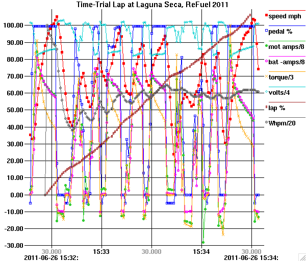 Another software project I've been working on recently (timesharing computer time with OVMS) is a little data graphing program named "graf" for use in X11 environments. It's one that I've used for work and personal data exploration over the past couple of decades, but recently I added several enhancements. It is quite lightweight, using only the base Xlib library and protocol, so it can display large datasets without choking. You folks may have your own favorite fancy graphing tools; this one has a somewhat different purpose than most. It is designed for data exploration more than presentation, using mouse functions to measure the distance between points or the slope of a line or calculate the least-squares regression line for a dataset or to zoom in on a section of the graph for a closer view. It takes a simple text file as input with an (x,y) pair of numbers on each line so it is easy to feed it with the output of a script, or it will accept multiple files as input to show each as a separate line on the graph. One unusual feature that was part of the recent enhancements is the ability to interpret Unix-style timestamps (based at 1970-01-01 00:00:00 GMT) as dates and times and to generate dynamic grid labels with varying temporal resolution depending upon what unit boundary the grid line represents. The motivation for varying the resolution is that to show a complete date and time down to microseconds takes too many characters to fit on each grid line. Each grid line label on the X axis shows the increment of time at the scale that allows the labels to fit, while at the left and right edges an additional label shows the remaining date and time information not included in the grid line labels. The format of the labels will vary to show a larger scale value on the even boundaries and as you zoom in the detail changes. Examples: 09/01 2014 03/01 06/01 09/01 2013 2014 22:30 23:00 23:30 04/26 00:30 01:00 2014-04-25 2014-04-26 45.000 50.000 55.000 23:56 05.000 10.000 15.000 20.000 25.000 2014-04-25 23:55: 2014-04-25 23:56: Although this varying format is not common, I think it is a pretty neat idea. In the actual graph window I use three levels of gray for the grid labels so the major boundaries are emphasized. And in local time, the DST transitions are handled properly (that was a challenge) by varying the grid spacing if needed. If you have an X11-Unix-ish environment and would like to try it out, the source is here (build it with ./configure then make): https://github.com/kernelsid/graf Or, I have MacOS and linux (CentOS) binaries here: http://casners.us/macos/graf http://casners.us/linxu/graf Try "graf -h" to see the usage text and Ctrl-H, ? or F1 in the window when running to pop up another window describing the mouse and keyboard functions. A three-button mouse or simulation thereof is needed to access the functions on the middle button. I've attached two data files that you could try along with a third that you could download since it is bigger than I want to put in email: 1) The first graph has a bunch of data lines for all the telemetry parameters collected from my Tesla Roadster log while driving on the track at Laguna Seca in the time trial event at ReFuel 2011. 2) The second dataset contains timestamps with fractional second resolution. This produces a graph of the difference between the internal-clock-based timestamps contained in the datastream generated by the little 8-pin PIC microcontroller that I used to extract the data from the two meters on our home solar PV system and NTP-derived timestamps in the computer that collects the datastream. The latter timestamps only have a resolution of one second, hence the +/-500ms noise. This is a good dataset for testing the linear regression function. 3) The third graph shows the output of the solar PV system on our home for a period of 7 days as measured in Amps as displayed on the meters connected to the left and right strings of panels in our system. This dataset demonstrates graf's speed since it contains 1.2 million datapoints, but that means the file is 49MB so rather than attaching it to this email I have it available for download from: http://casners.us/amps.graf If you want to run graf with these datasets, I suggest invoking it with "graf -Lmt" plus the dataset filename to select the X axis date display in local time and to show a small icon at each datapoint. I usually also include -t because I prefer just tickmarks rather than full grid lines most of the time. I also attached a screenshot of the first graph so you can at least see a static image if you don't want to try to run the program. -- Steve