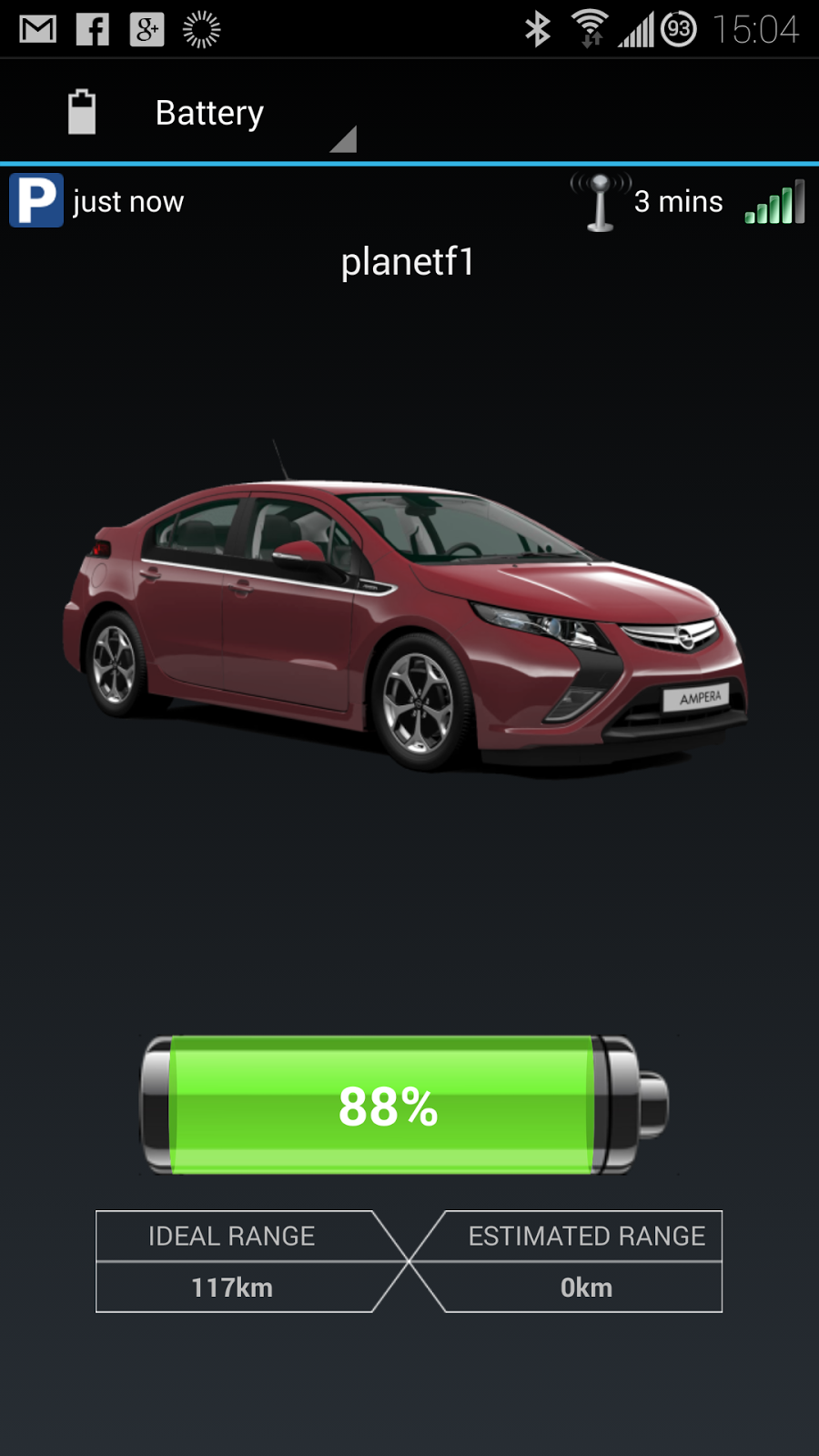 OVMS Nissan Leaf XXXX XXX:Not charging SOC: 88% Ideal Range: 117 km 3:00 PM