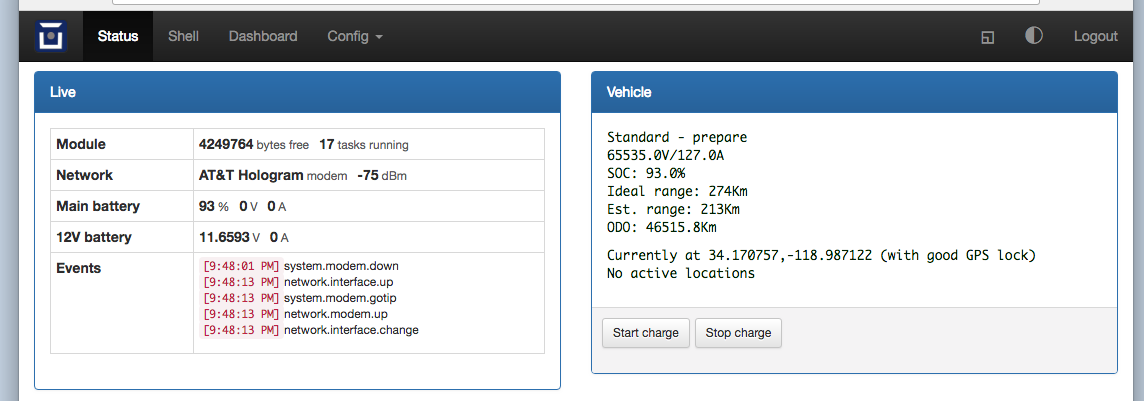 Mark, The vehicle id is TRS0879 and I tried to do the remote charge multiple times today beginning at ~12:40p PDT through to ~4:30p PDT [using the cellular modem]. This evening, beginning ~9:15p PDT, I've tried to start a charge remotely over Wifi. So far for all attempts, no joy. I've tried using both the Mobile app [iPhone], as well as the web app contained in the v3. All tries appear to timeout without starting the charge. I'm wondering if the "Timed Charge" status of the car, is overriding the request to "Start Charge" [immediately]. Thanks for your kind help with this. Chip On 2018-04-18 4:47 pm, Mark Webb-Johnson wrote: