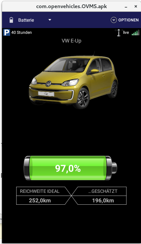 I just got the Android app running on the Linux desktop :-) On Debian Stretch I used an old emulator from 2016: Shashlik 0.9.3http: //www.shashlik.io/news/2016/03/02/shashlik-0-9-3/ Advantage - super simpleDisadvantage - buggy and not maintained any more But it is running well for me. Even with the correct locale: What I did ... Install ShashlikInstall OVMS apk in Shashlikhttps://www.howtoforge.com/ tutorial/how-to-install-and-run-android-apk-on-linux-with-shashlik/ Create folder ~/.local/share/shashlik/system Edit /opt/shashlik/android/config.ini hw.ramSize=8000 /opt/shashlik/bin/shashlik-run emulator_args change "-noskin" to "-skin", "480x800", Create an executable script /usr/local/bin/ovms containing: #!/bin/bashcd /opt/shashlik/bin/./shashlik-run com.openvehicles.OVMS com.openvehicles.OVMS.apk Start it with the command "ovms" on the console. Set locale in a second console: adb shell "setprop persist.sys.language de; setprop persist.sys.country DE;" After restart of the emulator locale is set. On a black screen with only arrows (yes, it is buggy): adb shell rm -rf "/data/system/*" and restart the emulator. Have fun ... Regards Chris