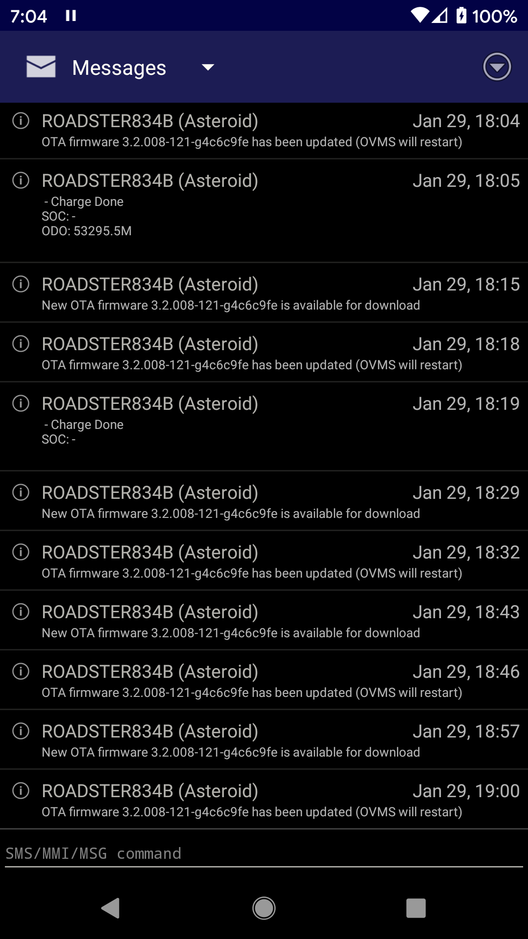 Hi Mark, Michael, Seems like what is happening is that the module keeps thinking a new update is available. Today was especially active for some reason. Screenshot of the Android application's log screen, attached. All versions appear to be the same. The car has simply been sitting in the garage on WiFi; no transitions of network access. Output of 'ota status' attached as well. Sorry, but I don't appear to have logging enabled. What specifically would you like logged? Greg Mark Webb-Johnson wrote: