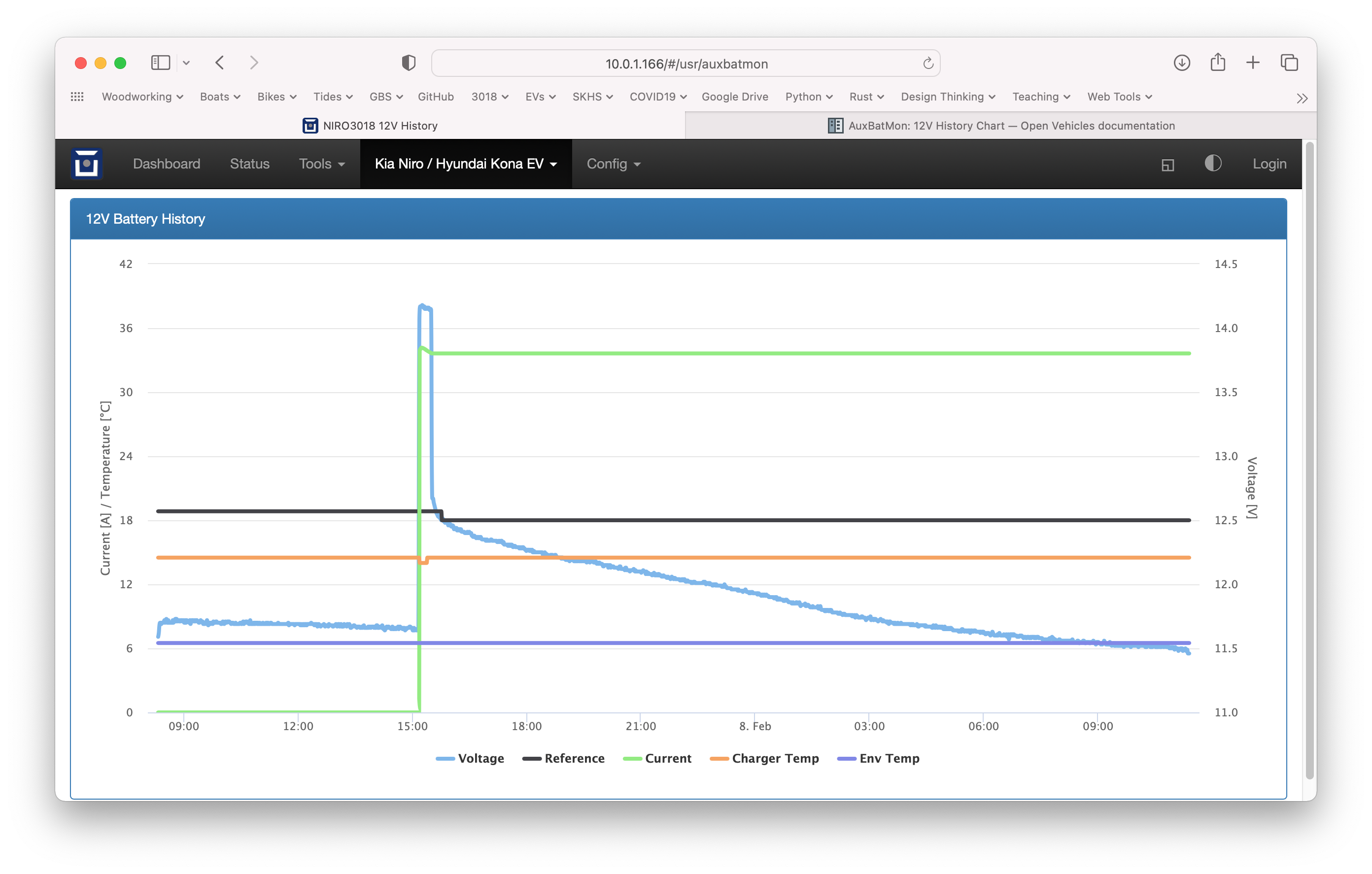 The 12V auxiliary battery in our Niro has died twice, so I decided to dig back into OVMS to see if it could shed any light on what is going on with the battery. I’ve installed the AuxBatMon <https://docs.openvehicles.com/en/latest/plugin/auxbatmon/README.html> plugin to log battery parameters and I have questions… The module is running: 3.3.003/ota_1/main (build idf v3.3.4-848-g1ff5e24b1b Sep 3 2022 11:32:12) — is this really the latest stable version? Here’s what I’m seeing: My questions: What is the source of the current value? Is it being reported by the vehicle? I’m puzzled by it remaining at a high constant value even after the charger appears to have shut down. Similarly with the charger and environmental temperature values — it seems add that they are mostly constant. If there is anyone out there with a Niro / Kona, I’d be curious to know what the behavior of your auxiliary battery looks like. Many thanks, Doug