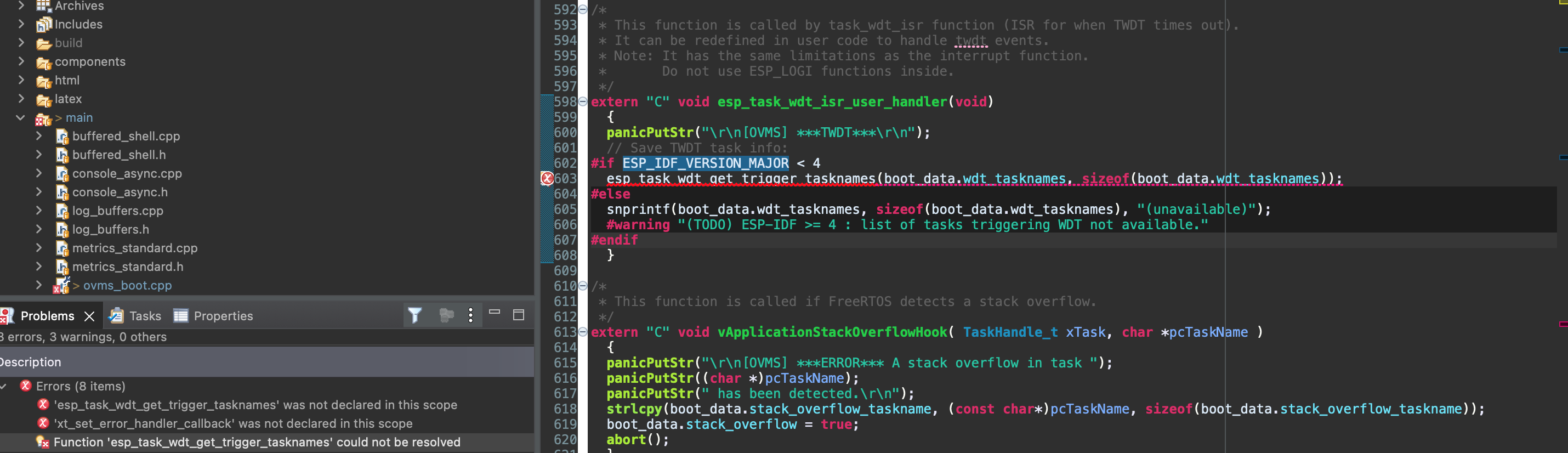 Hi All, I am hoping to start work on adding the VW e-Golf vehicle, but struggling with setup. Currently I am fighting two errors with esp_task_wdt_get_trigger_tasknames() and xt_set_error_handler_callback() not declared in scope. See attached. What I did: -went through dev setup doc (macOS) -pulled master -set up Eclipse IDE to build and flash using this <https://docs.espressif.com/projects/esp-idf/en/v4.3/esp32/get-started-legacy/eclipse-setup.html> I get the same errors when running "make flash" from the terminal. Any ideas? Thanks! Jared