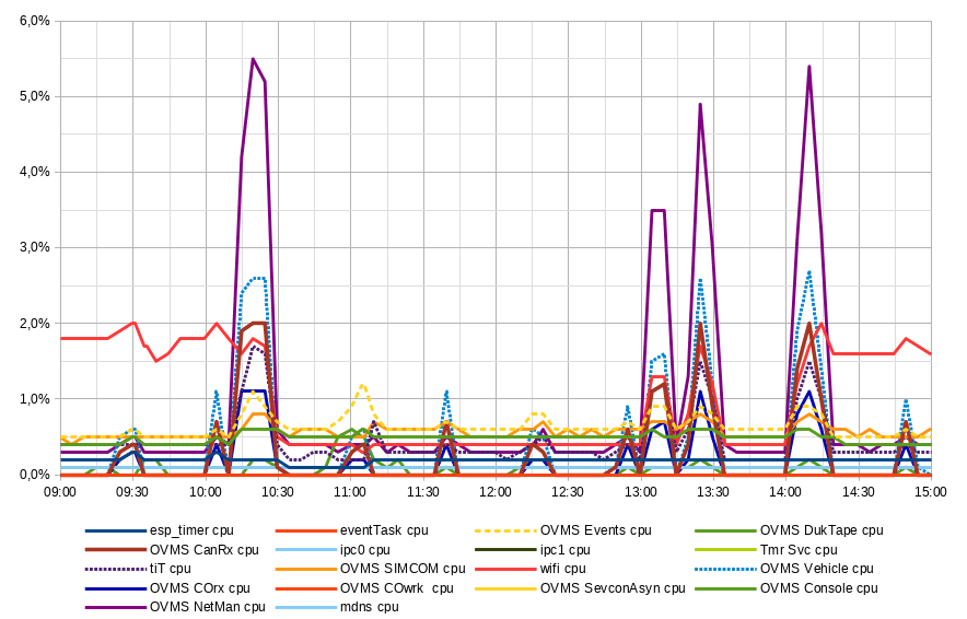 Mark, I did the same checks as you and came to the same conclusion. For the webserver timer, that looks non-trivial but really only pushes requests into the job queue and takes care to never block. A bit of a potential issue there is it does some logging in case of trouble (job queue full), and that may be bad if logging to an SD file is enabled. We still need to rework the file logging to use a separate task as well (issue #107). From my task data today, here are some first impressions on our normal CPU load: a) Idle tasks: b) Active tasks: 10:00 - 10:30 was a drive from home (wifi) to office (no wifi), then another drive 13:00 - 13:30 and back home 14:00 - 14:15. Driving load on the NetMan is caused by the web dashboard. The half hour peaks are from the 12V topping from the main battery the Twizy does when parked. So that's nowhere near "too much" in terms of CPU load -- normally. I'm waiting to catch the issue situation with this instrumentation. Regards, Michael Am 09.09.19 um 05:43 schrieb Mark Webb-Johnson:
