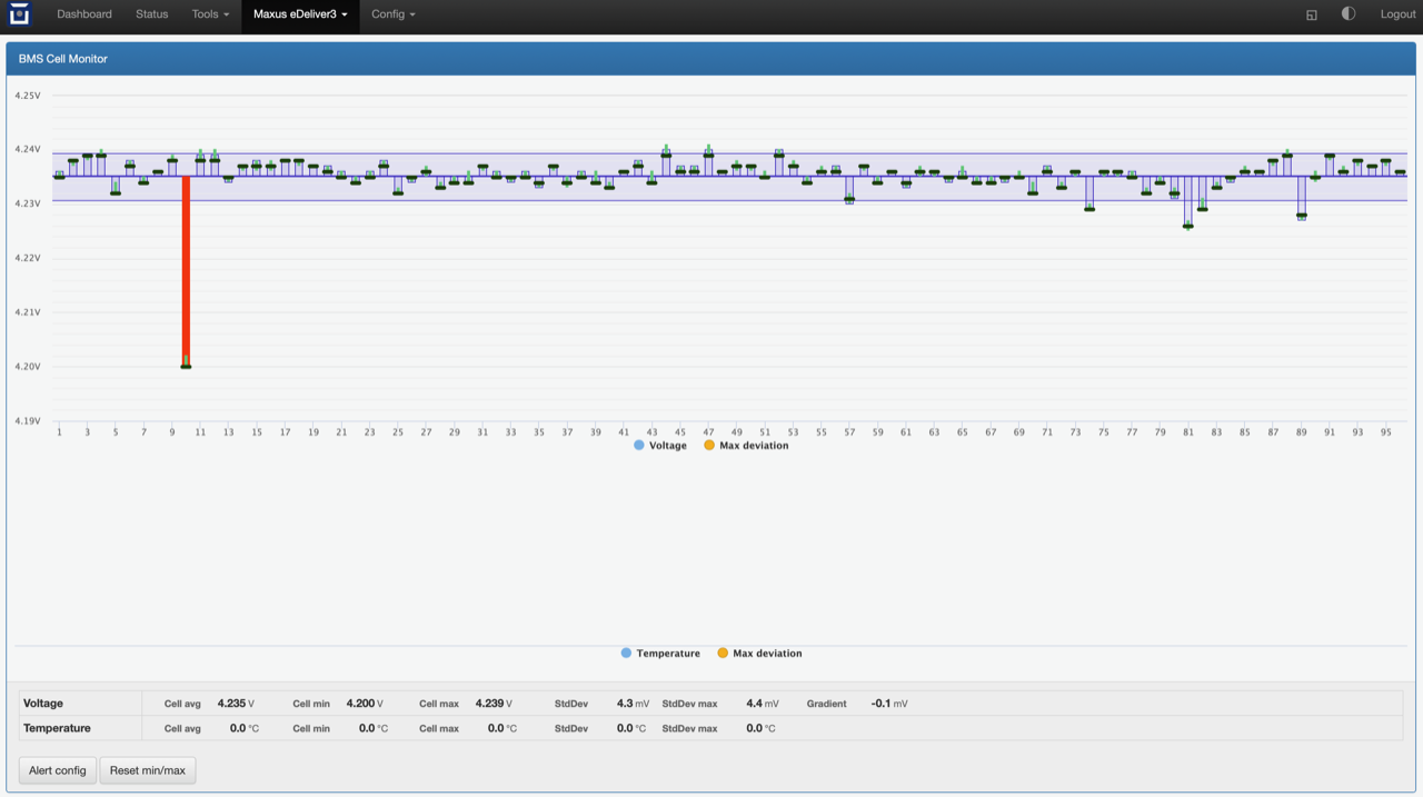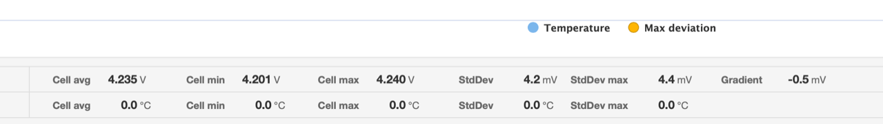 Shane, the standard deviation isn't the distance between the minimum and maximum, it's a measure of variation from the mean value. Standard deviation is one of the main basic statistical analysis tools. Read more on this on the web: https://duckduckgo.com/?q=standard+deviation In the battery chart, the standard deviation is shown as the horizontal stripe with light blue background. The maximum standard deviation observed since the last reset is shown by the two blue lines. A high standard deviation, especially under load, means a high cell drift = defective / aged / poorly selected pack. Regards, Michael Am 05.04.21 um 16:40 schrieb Shane @ Kilve Engineering: