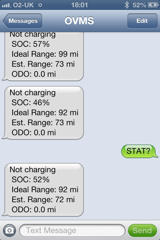 Just flashed my OVMS with your experimental github version 2.3.1 The App works fine, but the SMS shows some difference in comparison to what it looked like with the previous firmware: the ODO and the CAC values have different formats. ODO: I think it's in miles now and before it was km. CAC: now it's reported correctly with 3 digits - point - 2 digits.
