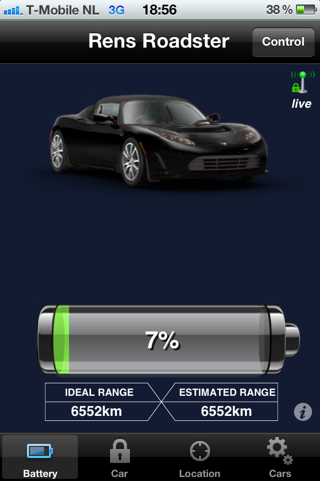 Hello Mark and other OVMS developers, Last week I was doing some tests how much kWh I could get out of the battery compared to the range. Also I am interested in how much KWh it needs to recharge the battery compared to the consumption. One of the tests was I charged in standard mode and drive to almost empty, write down the kWh consumed on the VDS trip screen and recharged in standard mode. I had some interesting results: After driving about 251 km doing 161 Wh/km it consumed about 40,5 kWh The VDS will show an ideal range and estimated range of 0 km, but by experience I know there is still juice left in the battery, but thanks to the OVMS app we can know still see how much is still left and feel a little more at ease, if we just need to go the extra mile to the charging station :) I attached a screen shot from the iPhone app and I must admit I giggled when I saw it first time. Let this be the future: 6552 km on one charge! But I think we hit a division by zero or something here. Another interesting remark I configured the minimum state of charge feature at 7%, hoping that it would send me warnings. But even when I hit 6% there was no warning. Could you explain how this feature works? Overnight I charged the car in standard mode and the next morning it showed on my kWh meter in my charging equipement and on the VDS that it used 52 kWh (so it seems to be quite accurate), but I only consumed 41 kWh during driving. My feeling is this is quite high, but I have not much data to compare this. So I stared to make note of the driving consumption and the charging consumption. To see with different mileage how much the losses are during charging. So this brings me to my question is there a way we can log or export the charging and consumption data by means of the OVMS application? This would make it easier to gather the statistics. I am also interested if someone has information or an explanation for the result I am measuring. One last question: could you explain the social group option within OVMS? Is this a way that other OVMS drivers could share their data? Then a big thank you to all involved creating the OVMS, I really love the digital speedo meter in the dashboard. I could not do without it anymore. BTW If any of the OVMS followers in Europe are going to: Tesla Motors Club @TeslaMotorsClub<http://twitter.com/#!/TeslaMotorsClub> 2. RWE eRace, Nürburgring as supporting program for 24h-Rennen Nordschleife 19.5.2012 http://bit.ly/ItauNN<http://t.co/OkgjBDfa> #tesla<http://twitter.com/#!/search/%23tesla> #ev<http://twitter.com/#!/search/%23ev> Please let me know. I am going so maybe we can meet at the event. Met vriendelijke groet / Best regards, Rens Meijer