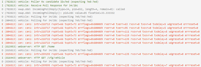 Hi guys, Want to report success on connecting and reading my VW e-Up via OBD cable using the Poller. As you can see in the screenshot of the log attached I get an IncomingPollReply(..) call and an SoC value of 33.333% Once I turn of the ignition and lock the car though I don't get any replies no more (line D 793813) and then I get can1 errors... I'm polling with 10 seconds intervall. I know that this is as it should be... but my issue is: I don't have any way to know if the ignition is on, the key is in, the car is running, the car is charging as the PIDs are not known for such values (afaik by the lists of sharkcow https://www.goingelectric.de/wiki/Liste-der-OBD2-Codes/). So what would be the best approach to change the different polling states? Can I somehow get called (in my vehicle-class) if an can-error is thrown? Then I would increase the poll frequency. Any suggestions? thanks Soko