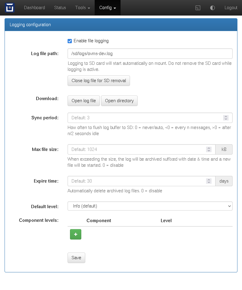 Craig, nearly there, you additionally need to set component "location" to level verbose. Changing logging levels via the web UI becomes effective immediately, no need to reboot. More on SD logging: https://docs.openvehicles.com/en/latest/userguide/logging.html#logging-to-sd... Regards, Michael Am 01.04.22 um 00:27 schrieb Craig Leres: