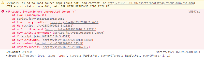 Simon, the css.map file isn't provided by the module. The actual error seems to be in the dashboard configuration, at least that's what could cause an eval syntax error as shown. That's the initial <script> block in the page response (use the network panel to see the full response). It should contain a valid JSON element. Regards, Michael Am 03.05.23 um 10:29 schrieb Simon Ehlen: