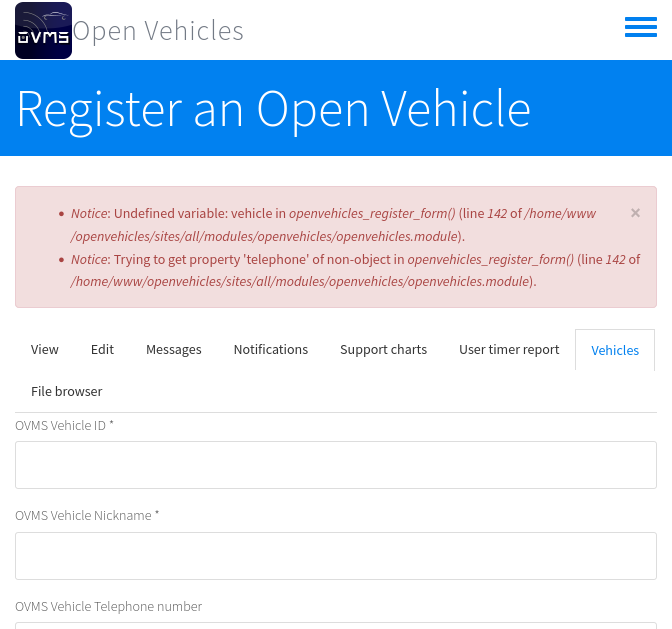 I just went to api.openvehicles.com to add a slot for my dev box and when I clicked on the "register an open vehicle" the form was preceeded by errors.