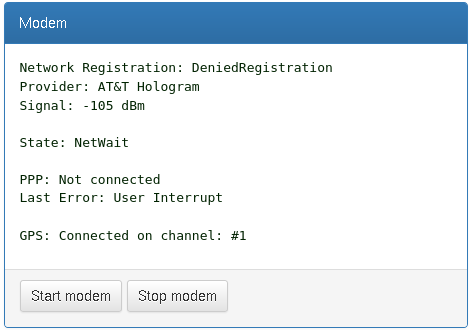 Craig, Thanks for the heads-up on this. I wasn’t aware of it. The DeniedRegistration thing is part of the GSM standards. If the SIM repeatedly can’t connect to the network, the modem itself backs off and won’t try for an exponential delay. There is a low-level AT command that can clear this, but normally best to wait for the network to recover. Regards, Mark. P.S. Also worth double-checking you still have balance on the account.