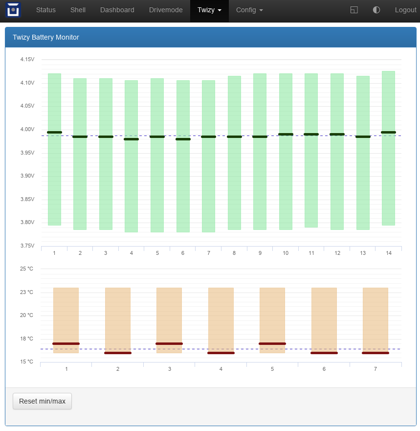 Yes, lots of metrics. I know that ;) OVMS# me li xrt.b. xrt.b.cell.01.volt.act 3.995V xrt.b.cell.01.volt.max 4.12V xrt.b.cell.01.volt.maxdev 0.01V xrt.b.cell.01.volt.min 3.795V xrt.b.cell.02.volt.act 3.985V xrt.b.cell.02.volt.max 4.11V xrt.b.cell.02.volt.maxdev -0.01V xrt.b.cell.02.volt.min 3.785V xrt.b.cell.03.volt.act 3.985V xrt.b.cell.03.volt.max 4.11V xrt.b.cell.03.volt.maxdev -0.005V xrt.b.cell.03.volt.min 3.785V xrt.b.cell.04.volt.act 3.98V xrt.b.cell.04.volt.max 4.105V xrt.b.cell.04.volt.maxdev -0.01V xrt.b.cell.04.volt.min 3.78V xrt.b.cell.05.volt.act 3.985V xrt.b.cell.05.volt.max 4.11V xrt.b.cell.05.volt.maxdev -0.01V xrt.b.cell.05.volt.min 3.78V xrt.b.cell.06.volt.act 3.98V xrt.b.cell.06.volt.max 4.105V xrt.b.cell.06.volt.maxdev -0.01V xrt.b.cell.06.volt.min 3.78V xrt.b.cell.07.volt.act 3.985V xrt.b.cell.07.volt.max 4.105V xrt.b.cell.07.volt.maxdev -0.01V xrt.b.cell.07.volt.min 3.78V xrt.b.cell.08.volt.act 3.985V xrt.b.cell.08.volt.max 4.115V xrt.b.cell.08.volt.maxdev -0.005V xrt.b.cell.08.volt.min 3.785V xrt.b.cell.09.volt.act 3.985V xrt.b.cell.09.volt.max 4.12V xrt.b.cell.09.volt.maxdev 0.005V xrt.b.cell.09.volt.min 3.785V xrt.b.cell.10.volt.act 3.99V xrt.b.cell.10.volt.max 4.12V xrt.b.cell.10.volt.maxdev 0.005V xrt.b.cell.10.volt.min 3.785V xrt.b.cell.11.volt.act 3.99V xrt.b.cell.11.volt.max 4.12V xrt.b.cell.11.volt.maxdev 0.01V xrt.b.cell.11.volt.min 3.79V xrt.b.cell.12.volt.act 3.99V xrt.b.cell.12.volt.max 4.12V xrt.b.cell.12.volt.maxdev 0.01V xrt.b.cell.12.volt.min 3.785V xrt.b.cell.13.volt.act 3.985V xrt.b.cell.13.volt.max 4.115V xrt.b.cell.13.volt.maxdev 0.005V xrt.b.cell.13.volt.min 3.785V xrt.b.cell.14.volt.act 3.995V xrt.b.cell.14.volt.max 4.125V xrt.b.cell.14.volt.maxdev 0.015V xrt.b.cell.14.volt.min 3.795V xrt.b.cell.15.volt.act 0V xrt.b.cell.15.volt.max 0V xrt.b.cell.15.volt.maxdev 0V xrt.b.cell.15.volt.min 0V xrt.b.cell.16.volt.act 0V xrt.b.cell.16.volt.max 0V xrt.b.cell.16.volt.maxdev 0V xrt.b.cell.16.volt.min 0V xrt.b.cell.cnt 14 xrt.b.cmod.01.temp.act 17°C xrt.b.cmod.01.temp.max 23°C xrt.b.cmod.01.temp.maxdev 1°C xrt.b.cmod.01.temp.min 16°C xrt.b.cmod.02.temp.act 16°C xrt.b.cmod.02.temp.max 23°C xrt.b.cmod.02.temp.maxdev 1°C xrt.b.cmod.02.temp.min 16°C xrt.b.cmod.03.temp.act 17°C xrt.b.cmod.03.temp.max 23°C xrt.b.cmod.03.temp.maxdev 1°C xrt.b.cmod.03.temp.min 16°C xrt.b.cmod.04.temp.act 16°C xrt.b.cmod.04.temp.max 23°C xrt.b.cmod.04.temp.maxdev -1°C xrt.b.cmod.04.temp.min 16°C xrt.b.cmod.05.temp.act 17°C xrt.b.cmod.05.temp.max 23°C xrt.b.cmod.05.temp.maxdev 1°C xrt.b.cmod.05.temp.min 16°C xrt.b.cmod.06.temp.act 16°C xrt.b.cmod.06.temp.max 23°C xrt.b.cmod.06.temp.maxdev -1°C xrt.b.cmod.06.temp.min 16°C xrt.b.cmod.07.temp.act 16°C xrt.b.cmod.07.temp.max 23°C xrt.b.cmod.07.temp.maxdev -1°C xrt.b.cmod.07.temp.min 16°C xrt.b.cmod.08.temp.act -40°C xrt.b.cmod.08.temp.max -40°C xrt.b.cmod.08.temp.maxdev 0°C xrt.b.cmod.08.temp.min -40°C xrt.b.cmod.cnt 7 xrt.b.pack.1.temp.alerts xrt.b.pack.1.temp.max 23°C xrt.b.pack.1.temp.min 16°C xrt.b.pack.1.temp.stddev.max 1°C xrt.b.pack.1.temp.watches xrt.b.pack.1.volt.alerts xrt.b.pack.1.volt.max 57.6V xrt.b.pack.1.volt.min 52.8V xrt.b.pack.1.volt.stddev.max 0.005V xrt.b.pack.1.volt.watches 1,2,4,5,6,7,11,12,14 xrt.b.pack.cnt 1 xrt.b.soc.max 100% xrt.b.soc.min 69.78% But if they are available in real time, they provide a very cool battery monitor, that displays per cell voltage breakdowns during driving: If metrics can use extram, 100 cells would be no problem. Regards, Michael