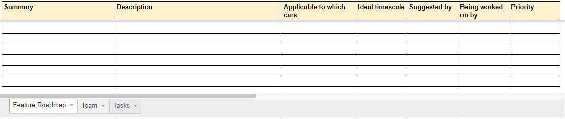 Hi, In response to a request for a road map there is now an easy to use Google Sheet where people can see the current road map, share what you are doing and what future features you would like to see. While doing that it's also a good opportunity to help new comers by pulling together a summary of the team and any (non feature) tasks people might be working on. Can you please therefore take a few minutes of your time in the next few days to fill in all three sheets below Thanks, Robert Sharpe Electric Vehicle Consultant 07711 252971 Your Plugged-in Partner Evergreen Consulting is the trading name of Sharpe Consultants Ltd