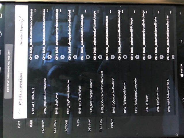 After months of stagnation, I am finally making some progress on Tesla Model S and X support. As a start, tonight’s edge update decodes the elusive estimated and ideal ranges. These cars are incredibly complex. Dozens of modules, 4 active CAN buses, an Ethernet network, two displays, and one of the busiest CAN buses I’ve ever seen. The CAN messages themselves are often packed tightly on bit (not byte) boundaries, so real hard to find the individual information items. The architecture itself is quite neat. There is a freertos based CAN gateway at the back of the Centre Information Display (CID). That takes all the CAN buses and gateways them to a single Ethernet connection joining the infotainment and other control systems. If the CID wants to transmit on the CAN bus (for example, to lock/unlock the doors), it sends a command to the gateway that converts it to a CAN bus message. Incoming CAN bus messaged get converted to UDP broadcasts. There is a great diagnostics tool built into the CID, but it is locked down by strong encryption. Rather than tear down my wife’s car, I think this is a better solution: It came from a scrapped, insurance written-off, Model S. I’ve also got this, but not much use for what I am doing at the moment. It didn’t take long to break into the diagnostics displays: And that is my first new message decode - the display SOC%, as well as rated and estimated ranges plus Wh/mile consumption. There is a huge amount of information there. Like the Tesla Roadster 1050 displays, on steroids... Hundreds of messages, all coming off the Ethernet. At the moment, the car is not connected, so I am just looking at messages from the MCU and Gateway themselves. But even that is close to 80 messages. I can see the values transmitted, and bus they are transmitted on, but no idea of CAN ID#, data length, or encoding. So, it is painstaking going through them one by one. The MCU messages themselves are a summary of car status, and look pretty good. Because they are isolated on the bench, it is relatively easy to work with them as a starting subset, and I am concentrating on the ones useful to OVMS (battery status, charge status, etc). It seems we have full charge status available, including supercharging, and the reason for charge termination. Once I’ve got the MCU messages decoded, it will be time for: $ nc mycar.local 3000 | nc bench.local 3000 to send all the data from the car to the bench and see what is displayed. I can then mess with the messages (fuzzing) to try to identify IDs and then data. The result of this work should be full OVMS support, and three DBC files describing the data. It would be much easier to have OVMS directly connected to the Ethernet, but Tesla will probably at some time lock that down, and it is so troublesome to take the dash apart to man-in-the-middle that. Regards, Mark.