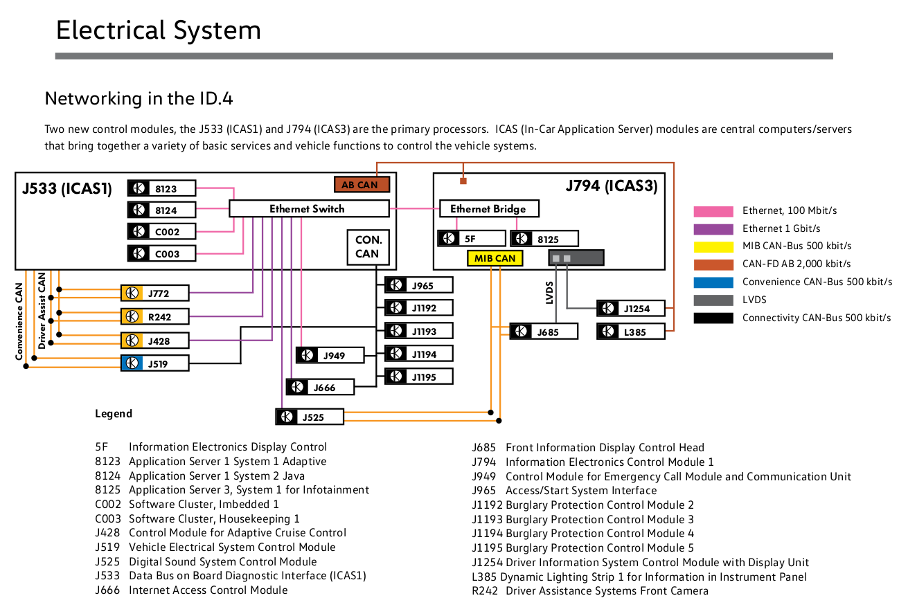 I took a look at the MEB platform about a year ago. I found an overview of the networking of the ID.4 in VW's "Self Study Program 891213". That was intimidating compaired to the e-UP. It is far more complex and very different. Regards Chris Am Sonntag, dem 24.04.2022 um 09:19 +0200 schrieb Michael Balzer: