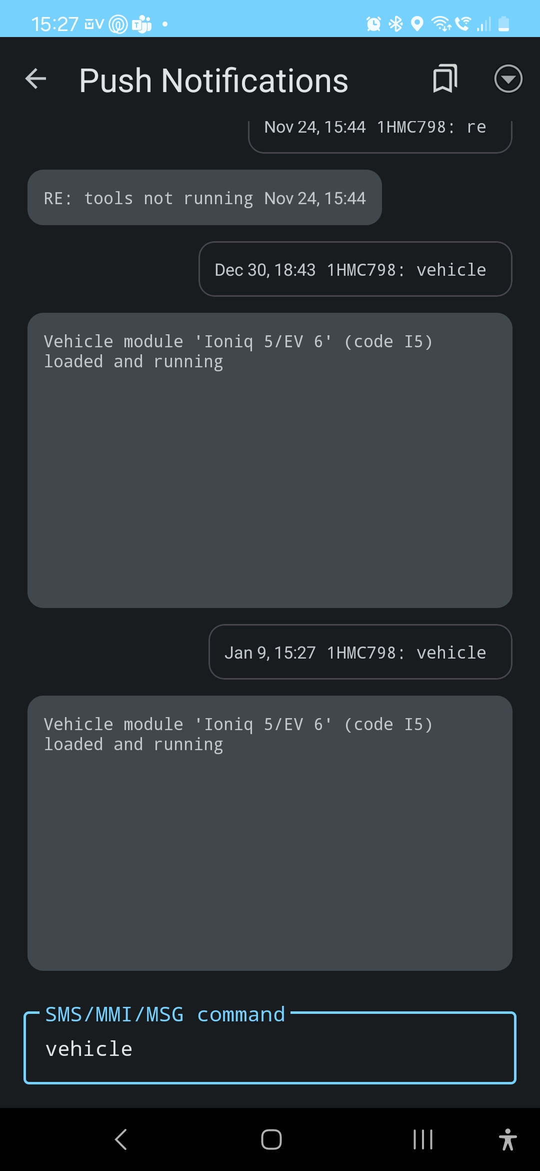 Looking good! No crashes when charging Shows as Ioniq 5 The widget starts the app correctly. One thing I found was in the Push Notifications/ command area: Portrait mode: Note the really big boxes. This is because the date column is squished to a couple of pixels and it is displaying it wrapped downwards. Looks fine in landscape mode //.ichael On Tue, 31 Dec 2024, 15:47 Michael Geddes, <frog@bunyip.wheelycreek.net> wrote: