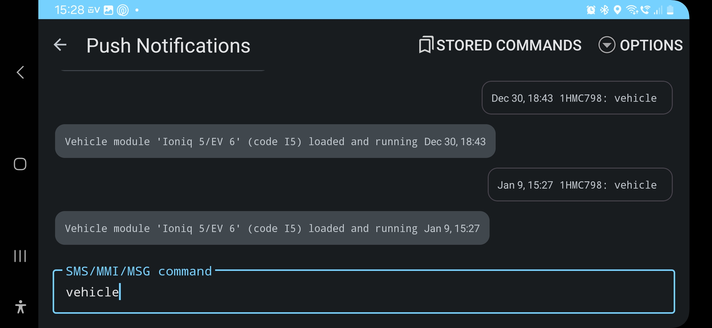 In the last days I saw that the app sometimes didn't want to connect to the server. Changing the view from "vehicle" to i.e. "settings" did bring the connection back.