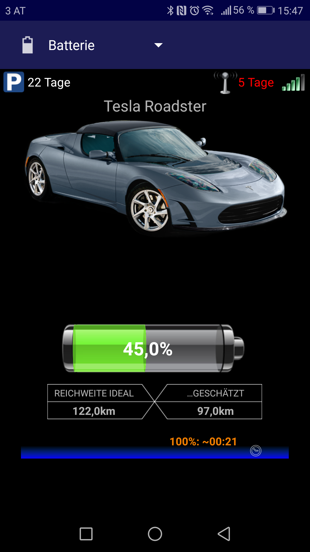I have an OVMS user asking about this: What is the “100%: ~00:21” in the bottom (just above blue bar)? Also, what is the clock like symbol there? I guess it is time to charge to 100%? But with a roadster battery at 45% SOC, that is not possible. Also, car is not actually plugged in or charging. Regards, Mark.