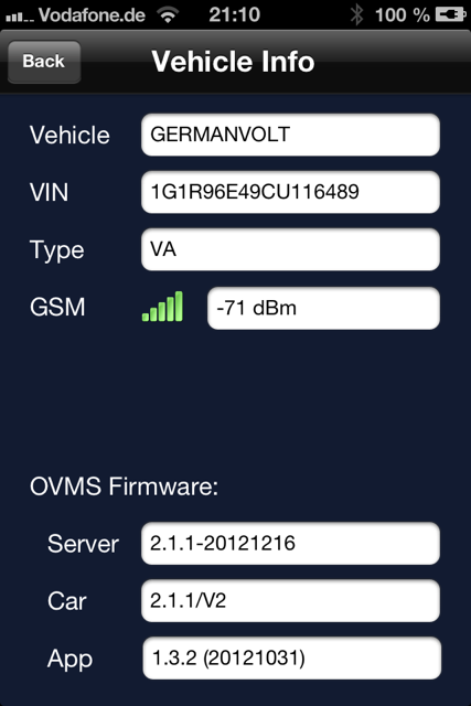 Hi, check it out. Compiles without error. Change the code in vehicle_voltampera.c for the VIN to this: ---------code------------- else if ((CANctrl & 0x07) == 3) // Acceptance Filter 3 (RXF3) = CAN ID 4E1 { // The VIN can be constructed by taking the number "1" and converting the CAN IDs 4E1 and 514 to ASCII. // So with "4E1 4255313032363839" and "514 4731524436453436", // you would end up with 42 55 31 30 32 36 38 39 47 31 52 44 36 45 34 36, // where 42 is ASCII for B, 55 is U, etc. for (k=0;k<8;k++) car_vin[k+9] = can_databuffer[k]; car_vin[17] = 0; } else if ((CANctrl & 0x07) == 4) // Acceptance Filter 4 (RXF4) = CAN ID 514 { car_vin[0] = '1'; for (k=0;k<8;k++) car_vin[k+1] = can_databuffer[k]; //car_vin[16] = 0; } ---------code------------- Burn it to the Module. Active since 21:09 CET (UTC+1) 26.12.2012 And here you can see the result: It looks like it works. :-) Bye mikeljo BTW: why has the Car Firmware in the GIT 1.3.2 and the Developer Version in iTunes 1.3.3? Am 26.12.2012 um 20:19 schrieb Michael Jochum <mikeljo@me.com>: